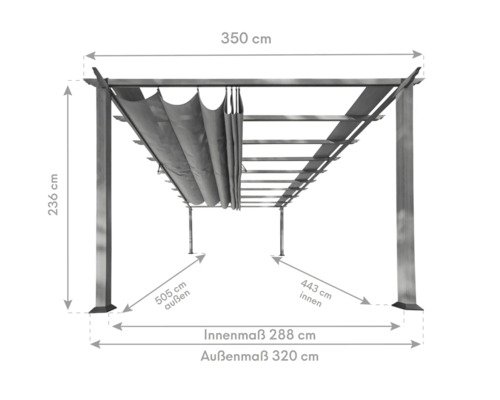 - Aufstellmaße B x T ohne Dachüberstand: 350 x 505 cm
