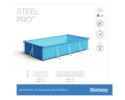 Das FrameLink System™ des korrosionsbeständigen Stahlrahmens gewährleistet die Stabilität und sichere Verbindung der einzelnen Rahmenelemente. Die Poolfolie besteht aus widerstandsfähigem, verstärktem DuraPlus™ -Material mit enorm robusten, reißfesten Eigenschaften.