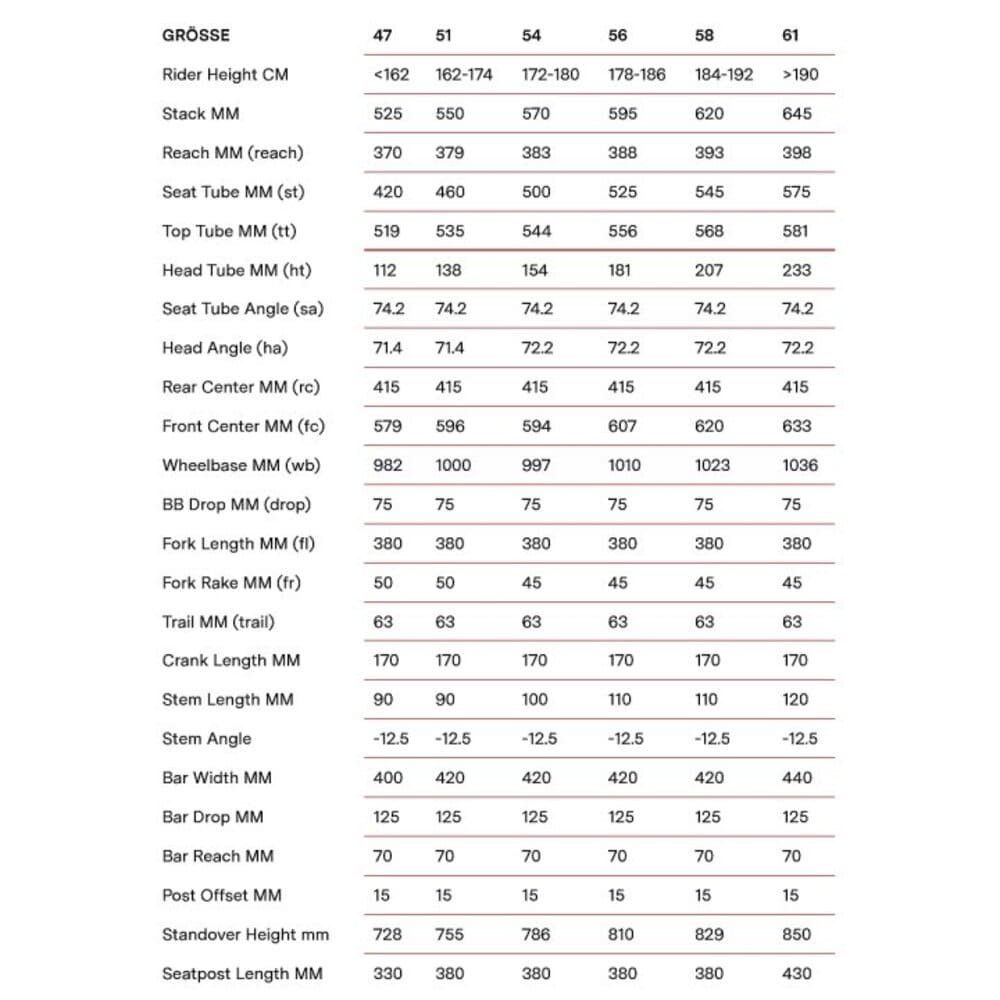47 cm, 51 cm, 54 cm, 56 cm, 58 cm, 61 cm