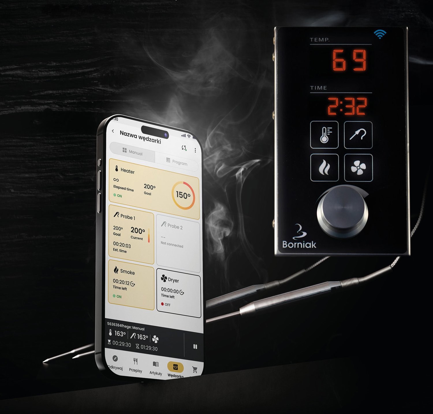 Die neuste Generation der Borniak Räucheröfen ist mit einer digitalen WiFi Steuerung ausgestattet, die es ermöglicht, den kompletten Räuchervorgang komfortabel per BorCook-App zu kontrollieren und zu steuern. Einfacher kann das Räuchern nicht sein: Räucherspäne in die Kammer des Rauchgenerators einfüllen und den Räucherofen bequem per Smartphone oder Tablet bedienen.