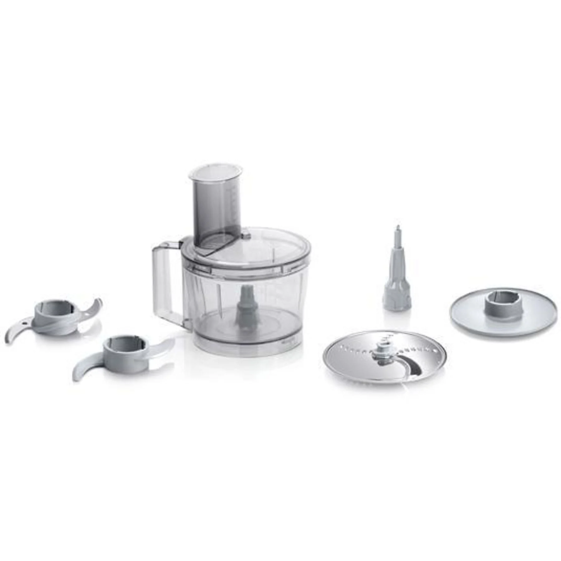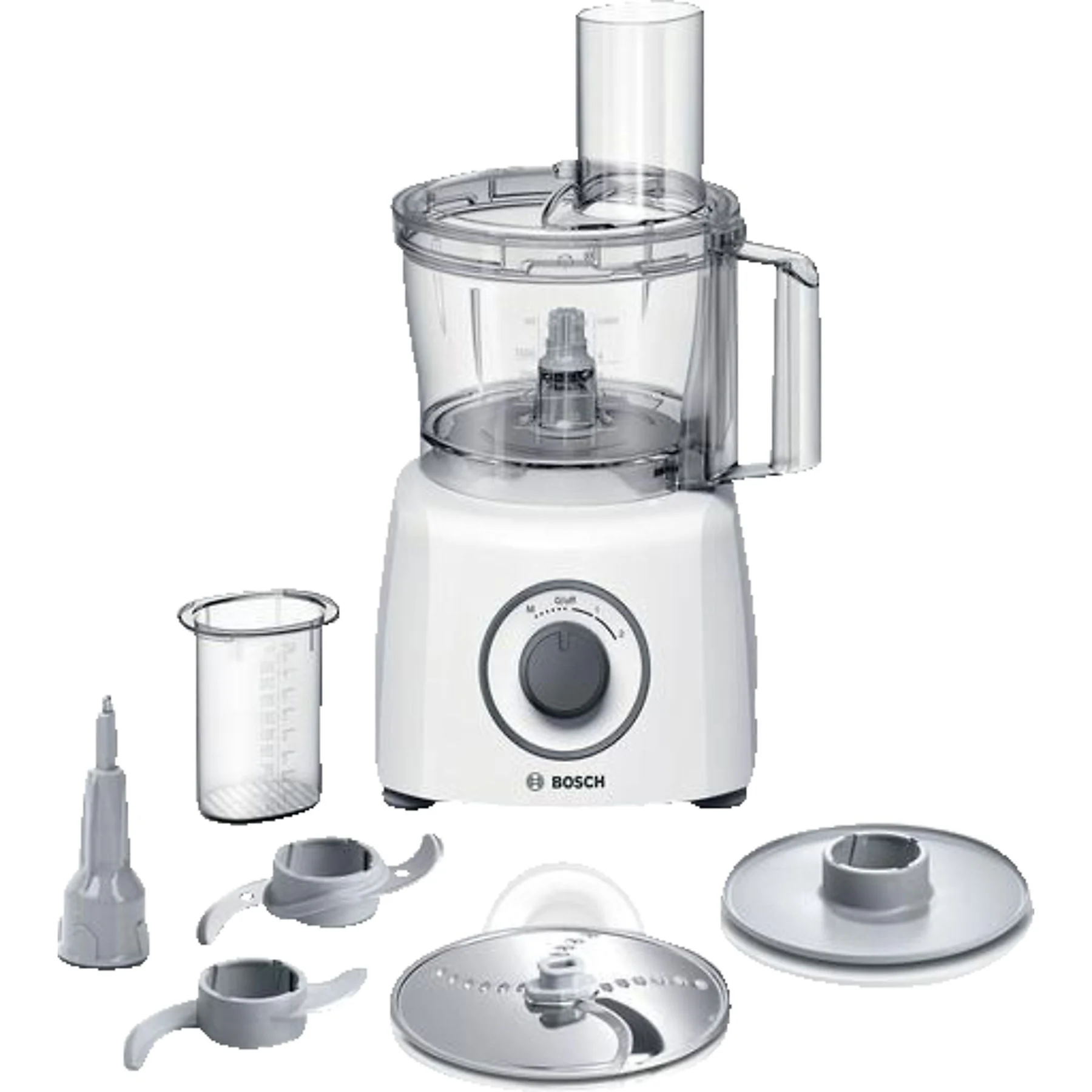 Die BOSCH MCM3100W Kompaktküchenmaschine wird mit verschiedenen Aufsätzen und Zubehörteilen geliefert. Dazu gehören Schneid- und Raspelscheiben, ein Mixbehälter sowie ein Messeraufsatz für fein- und grob zerkleinern.