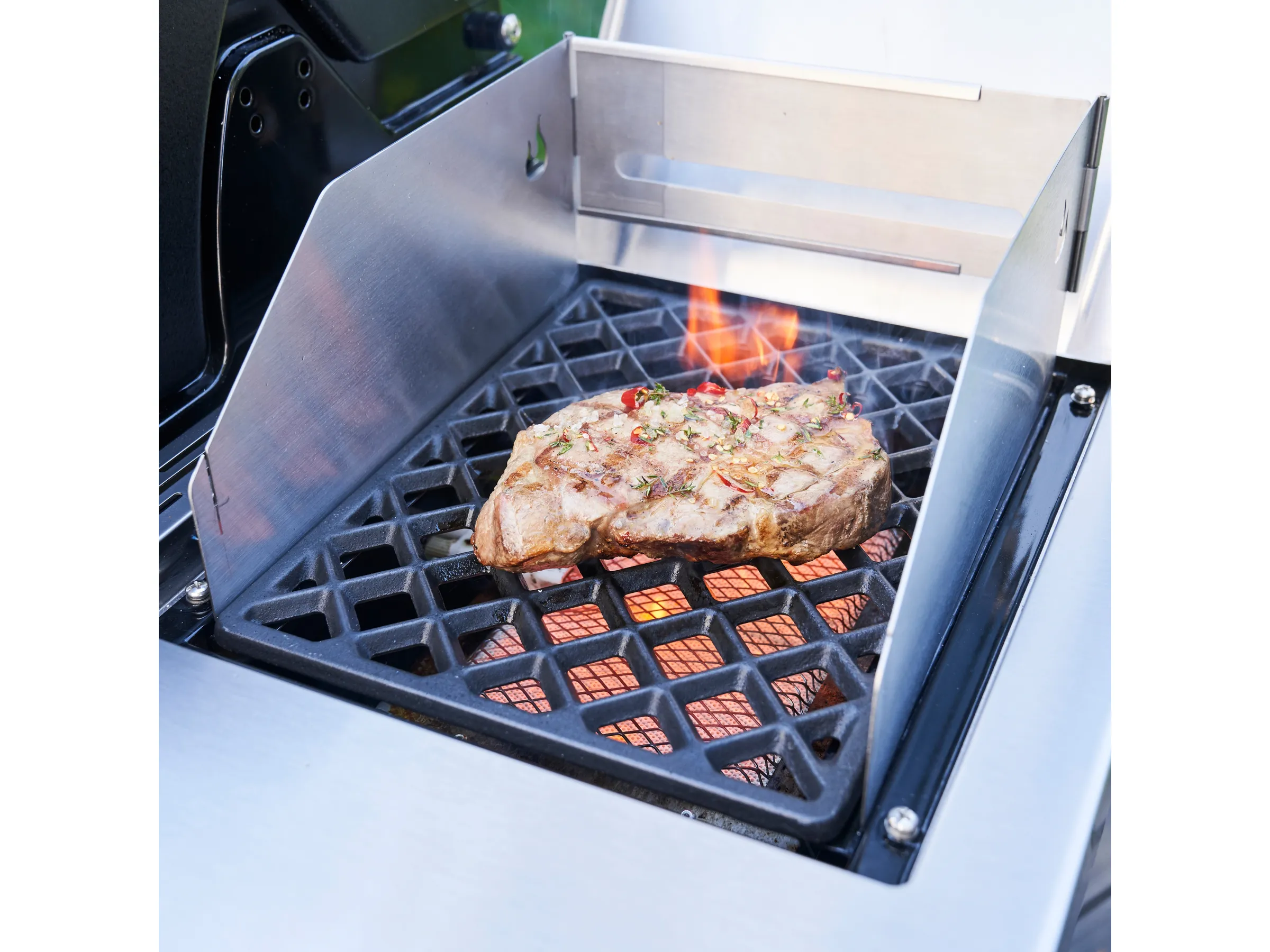 Der Sear-Brenner im Seitentisch erreicht Temperaturen bis zu 900 °C und dient somit zum scharfen Angrillen von Fleisch. Dadurch erhält dein Grillgut schöne Grillstreifen, während es im Inneren um 50 % saftiger bleibt. Dabei punktet das Grillsystem zusätzlich mit einem um 30 % geringeren Gasverbrauch und verhindert gefährliches Aufflammen.