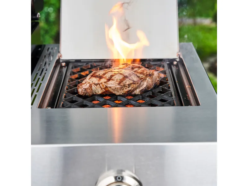 Der Sear-Brenner im Seitentisch erreicht Temperaturen bis zu 900 °C und dient somit zum scharfen Angrillen von Fleisch. Dadurch erhält dein Grillgut schöne Grillstreifen, während es im Inneren um 50 % saftiger bleibt. Dabei punktet das Grillsystem zusätzlich mit einem um 30 % geringeren Gasverbrauch und verhindert gefährliches Aufflammen.