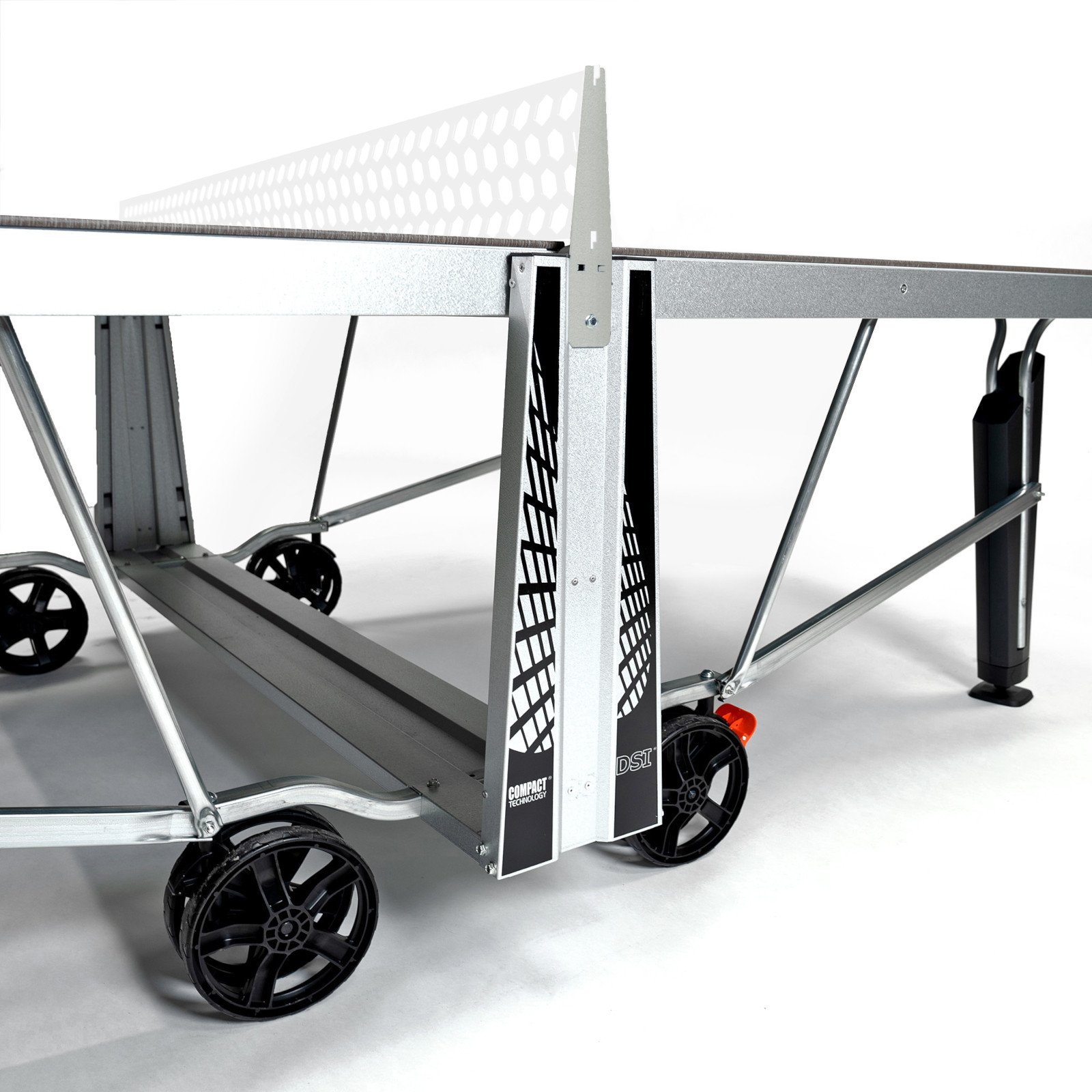 Die Cornilleau Outdoor Tischtennisplatte ist klappbar. So können Sie die Tischtennisplatte platzsparend verstauen oder mit nur einer eingeklappten Seite allein trainieren. Das DSI-System von Cornilleau gewährleistet dabei, dass das Zusammenklappen leicht und vor allem sicher vonstatten geht.