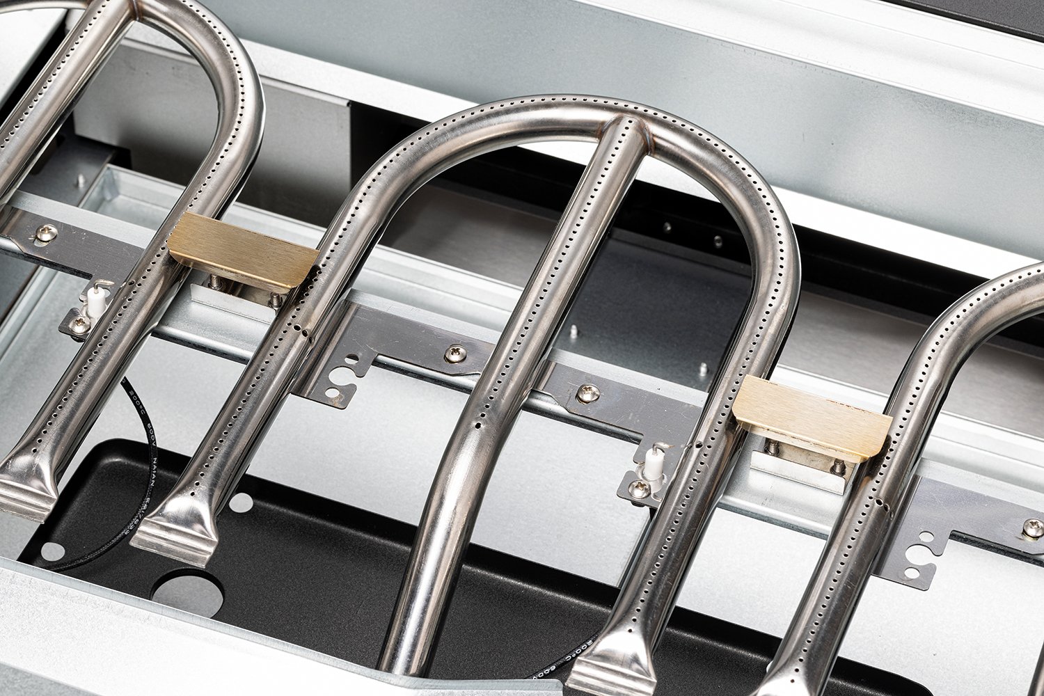 - 3 separat regulierbare, U-förmige Brenner aus Edelstahl mit 7,5 kW Leistung & elektrischer Zündung – Temperaturen bis zu 350 °C