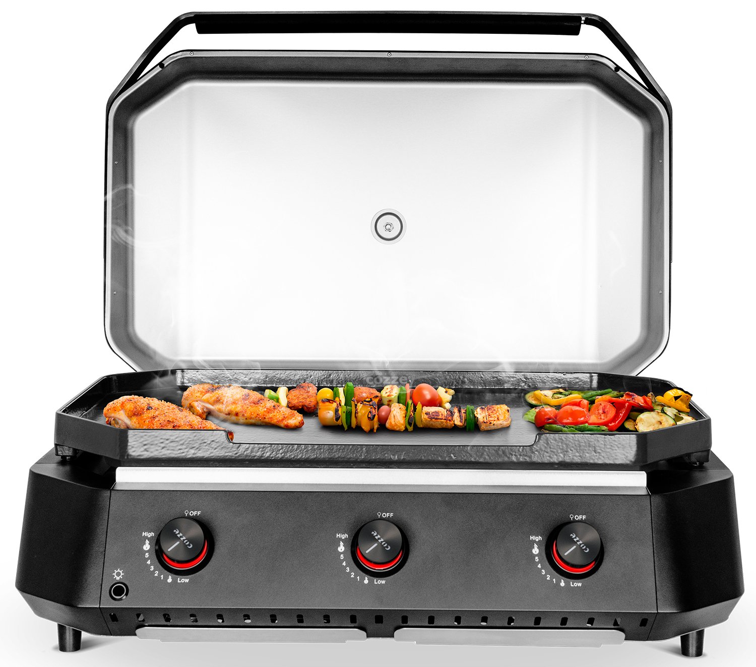 - Vielseitiger Plancha Gasgrill mit drei U-förmigen Edelstahl Brennern – 7,5 kW Gesamtleitung & elektrische Zündung – für Temperaturen bis zu 350 °C