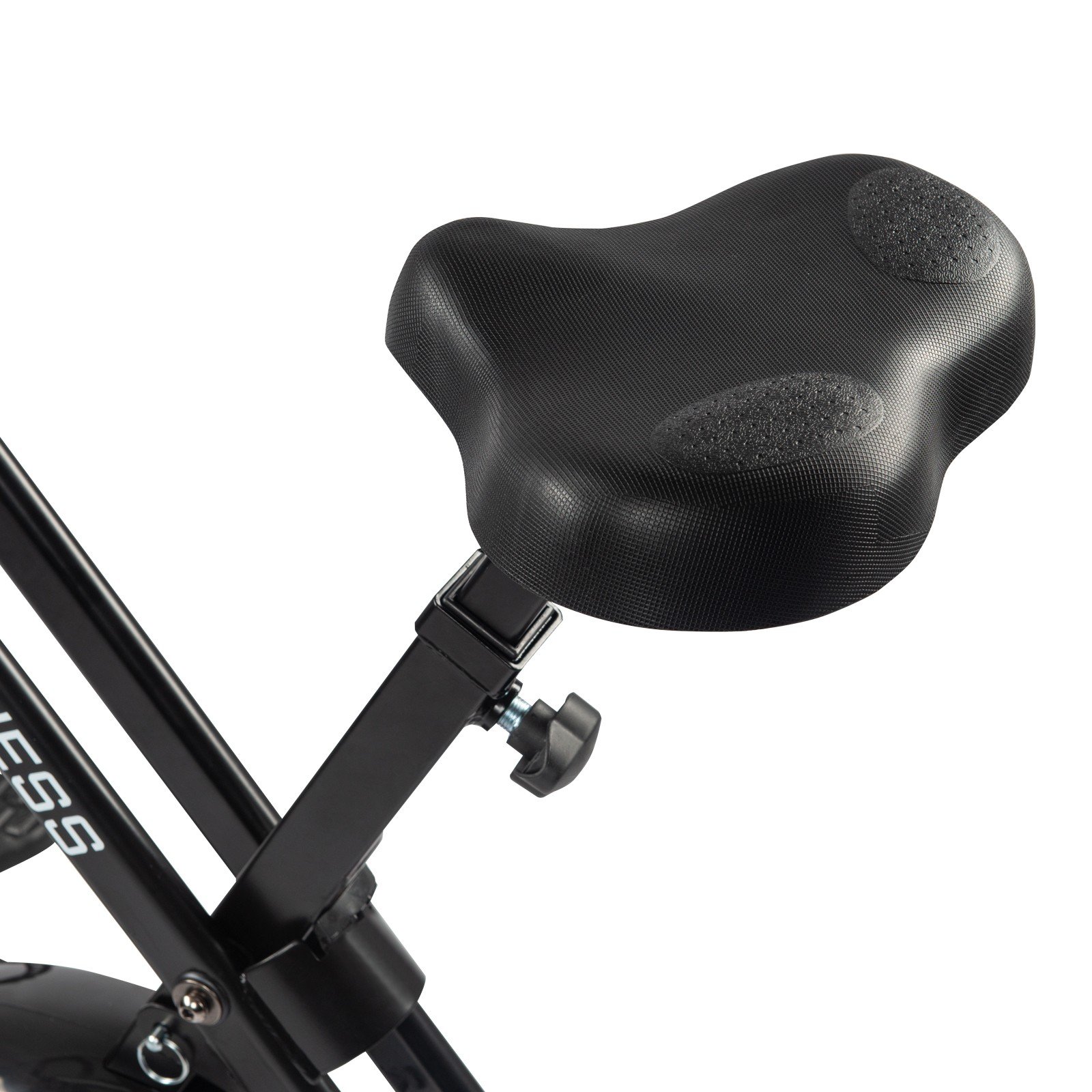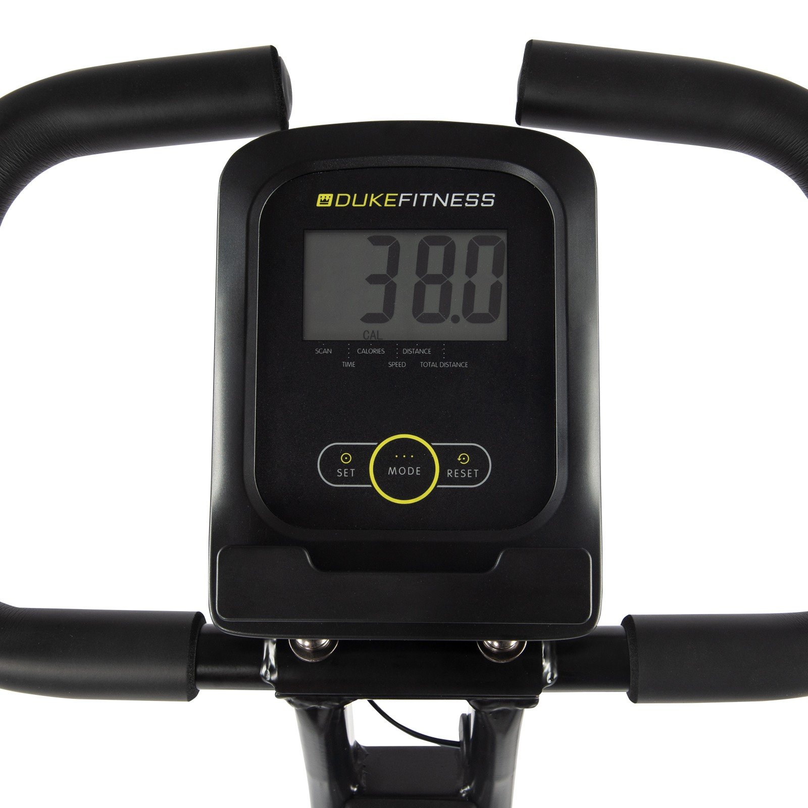 Das Fitness-Rad von Duke Fitness können Sie ganz leicht verstellen. Das Gerät wiegt gerade einmal 15,5 kg und verfügt auch noch über Transportrollen. Nach dem Training lässt es sich zusammenklappen und platzsparend verstauen.