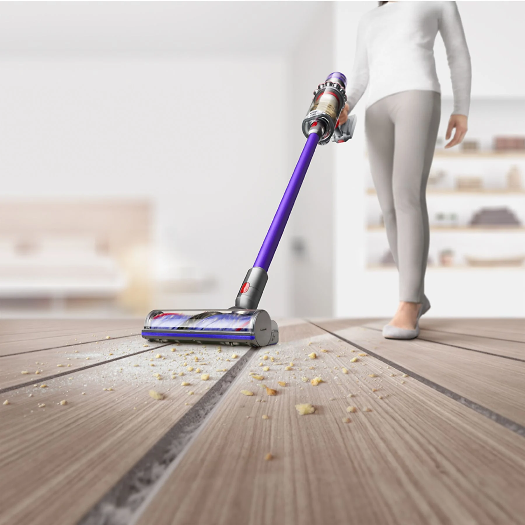 Le passage du mode sol au mode aspirateur à main se fait sans effort, ce qui facilite le nettoyage des meubles, étagères et surfaces en hauteur. Dyson V11 Advanced s’adapte ainsi à toutes les configurations domestiques.