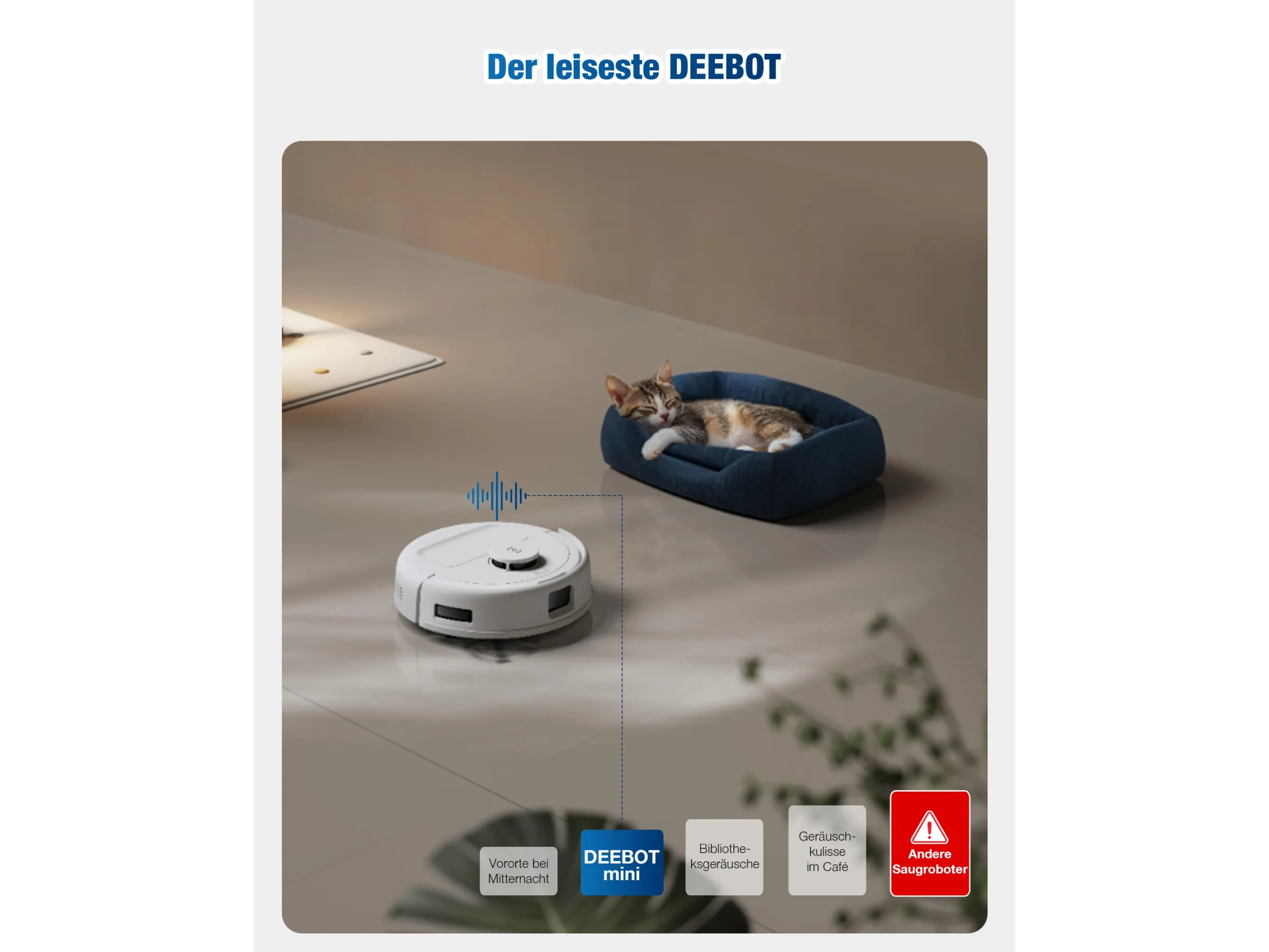 Ein großer Vorteil des ECOVACS DEEBOT Mini ist sein leiser Betrieb. Dadurch kann er auch während Gesprächen, beim Fernsehen oder sogar während der Arbeitszeit eingesetzt werden, ohne störend zu wirken. Dies ist besonders in Wohnungen mit wenig Platz ein großer Pluspunkt.