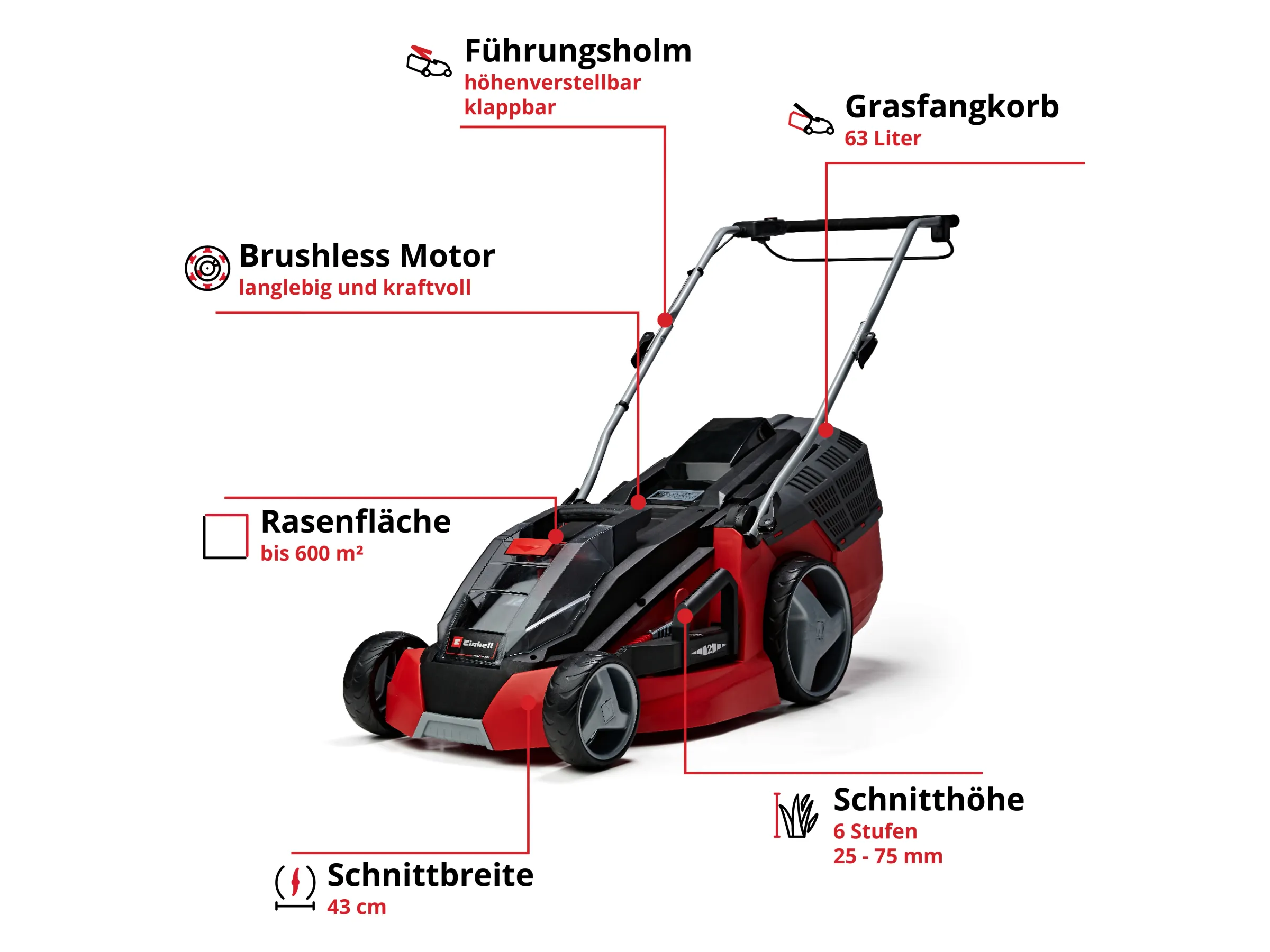 Dank der praktischen Schnitthöhenverstellung lässt sich die Graslänge in sechs Stufen von 25 mm bis 75 mm individuell auf das gewünschte Ergebnis einstellen. Die hochwertigen Messer haben eine Schnittbreite von 43 cm und sorgen für einen präzisen und pflanzenschonenden Grünschnitt. Mit einem bürstenlosen Motor arbeitet der Akku-Mäher dabei äußerst effizient und leistungsstark ohne Verschleiß.