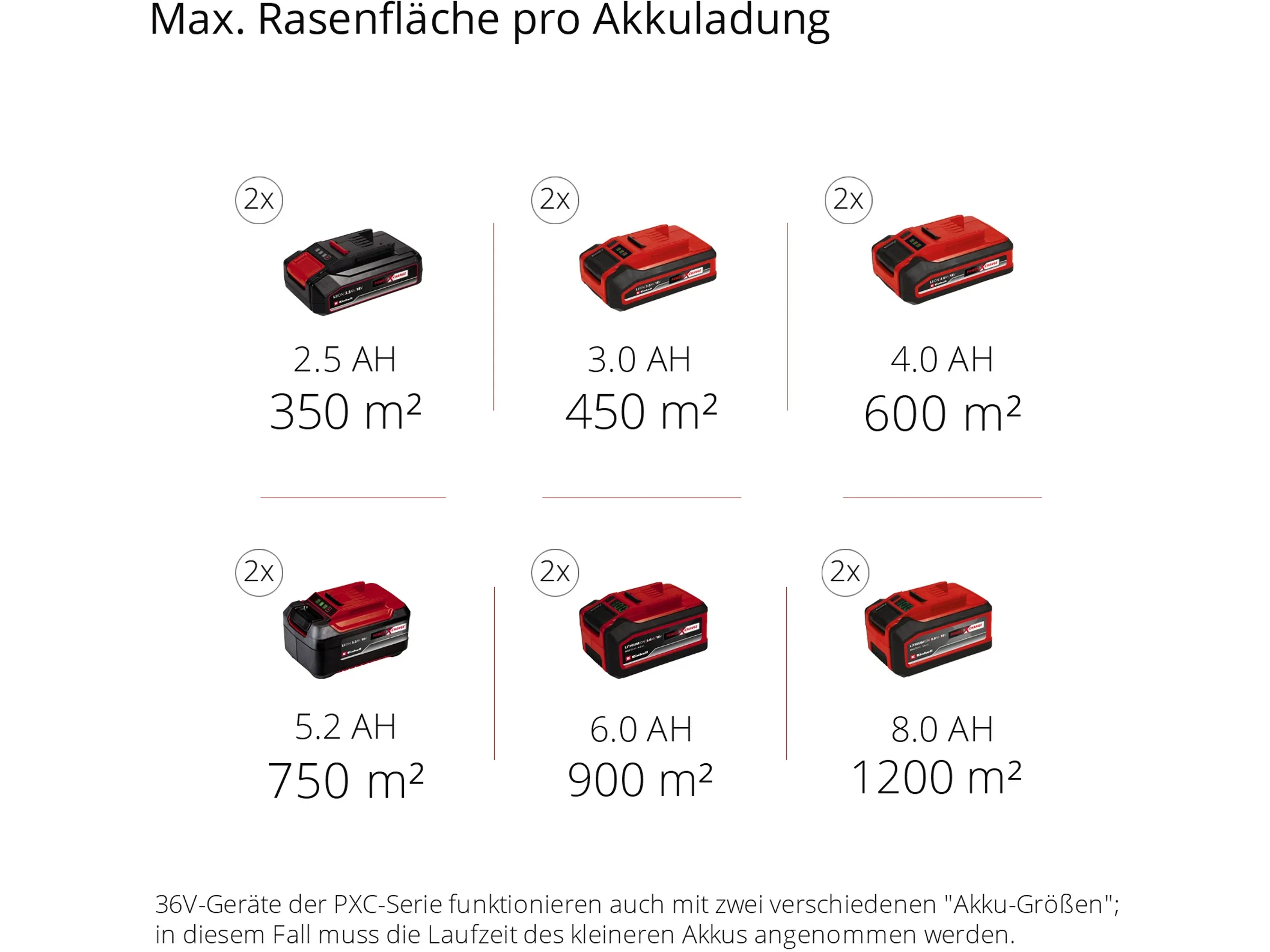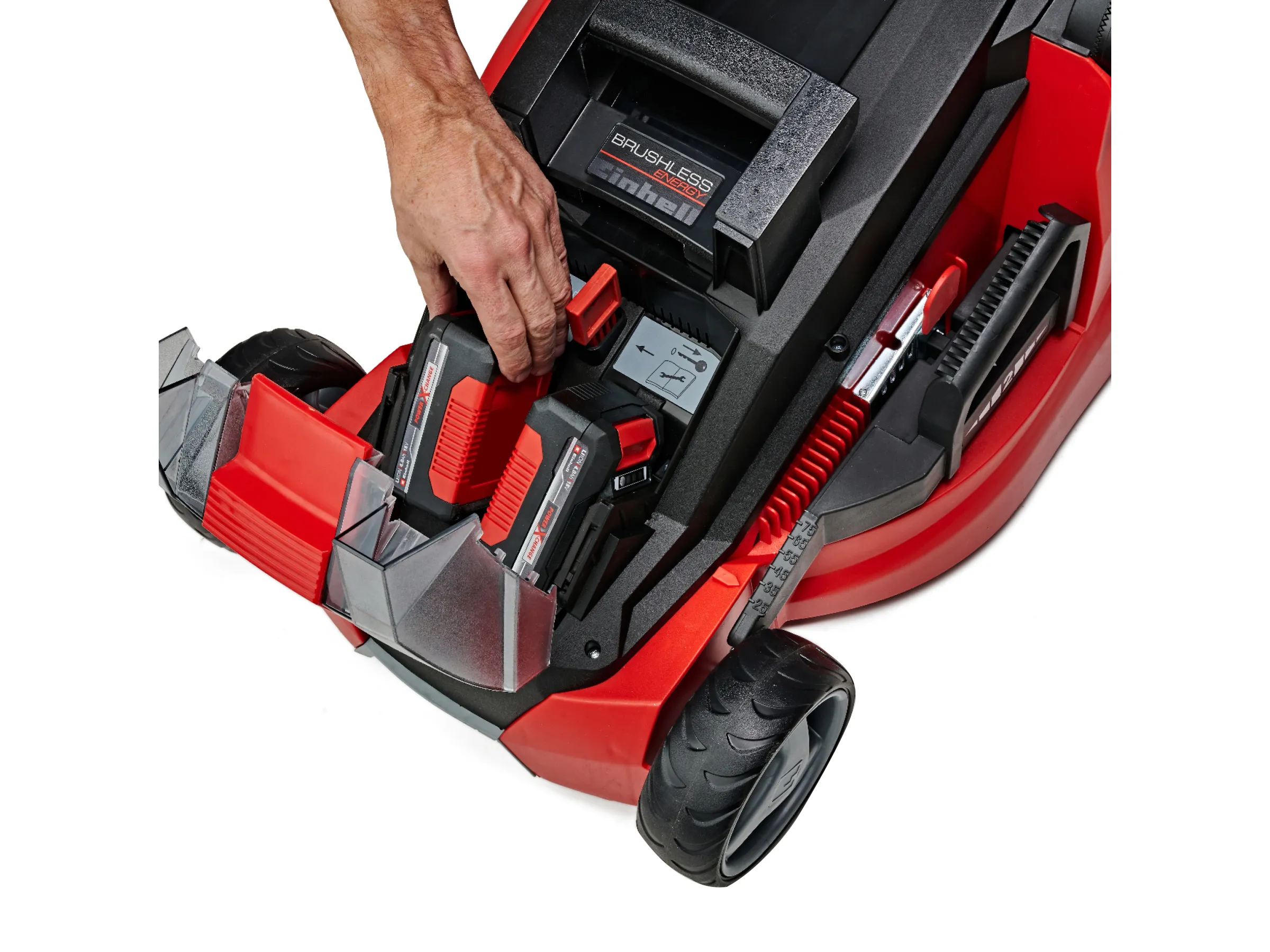 Der Rasenmäher wird mit zwei 18 V Lithium-Ionen-Akkus betrieben. Die Akkus sind Teil der Einhell Power X-Change Serie und mit allen Geräten aus dieser Reihe kompatibel und können flexibel genutzt werden. Mit 3 LEDs wird der Ladezustand der Akkus angezeigt. Durch die moderne Lithium-Ionen-Technologie sind die Akkus nicht anfällig für den Memory-Effekt und lassen sich dank des enthaltenen Schnellladegeräts innerhalb kürzester Zeit wieder aufladen.