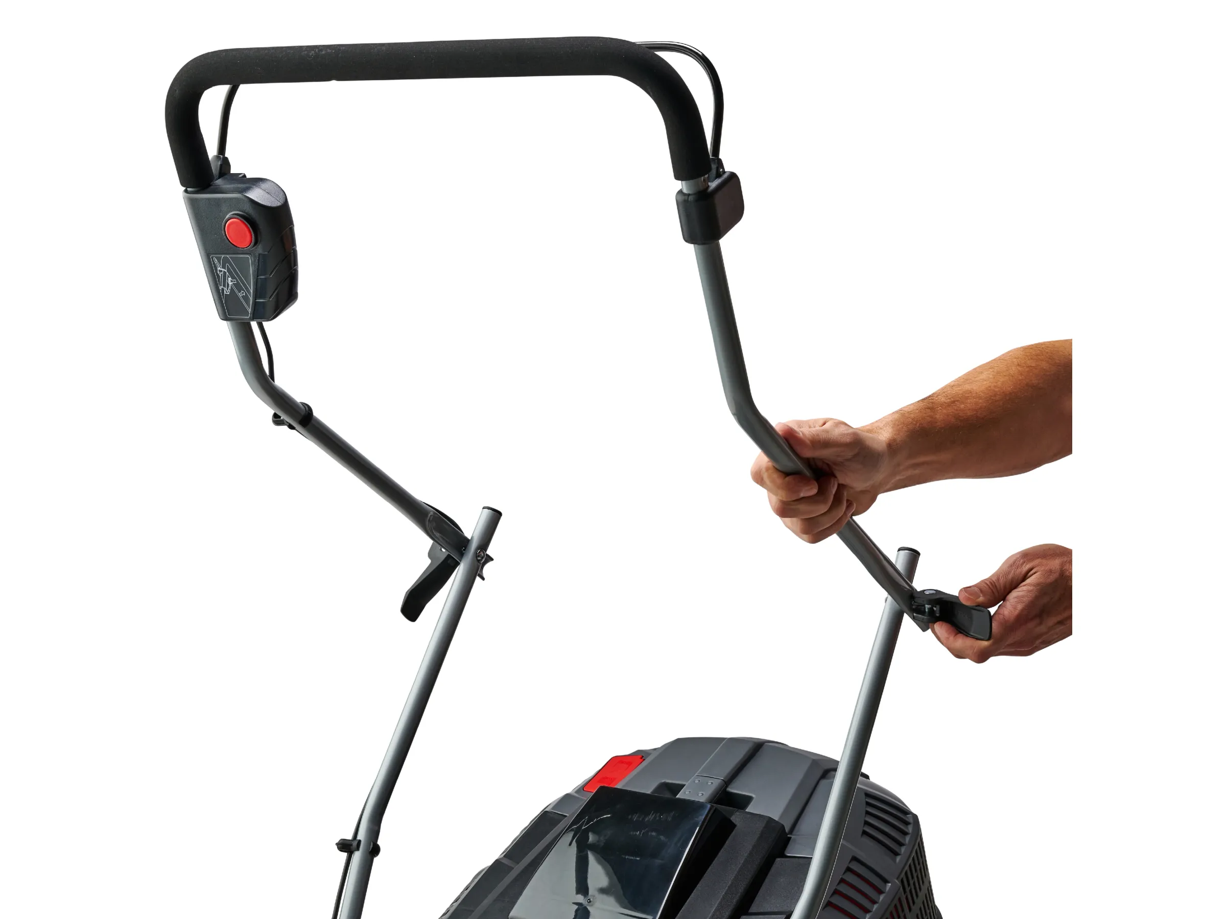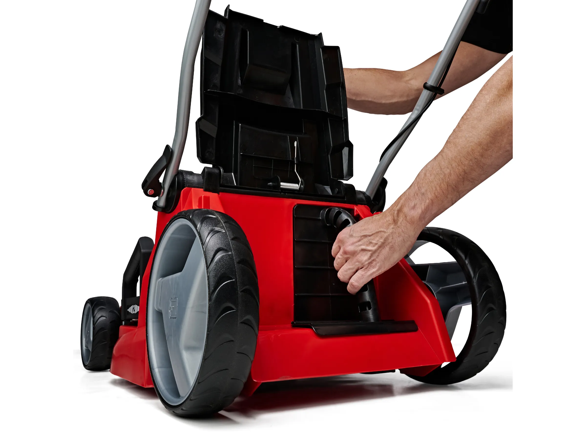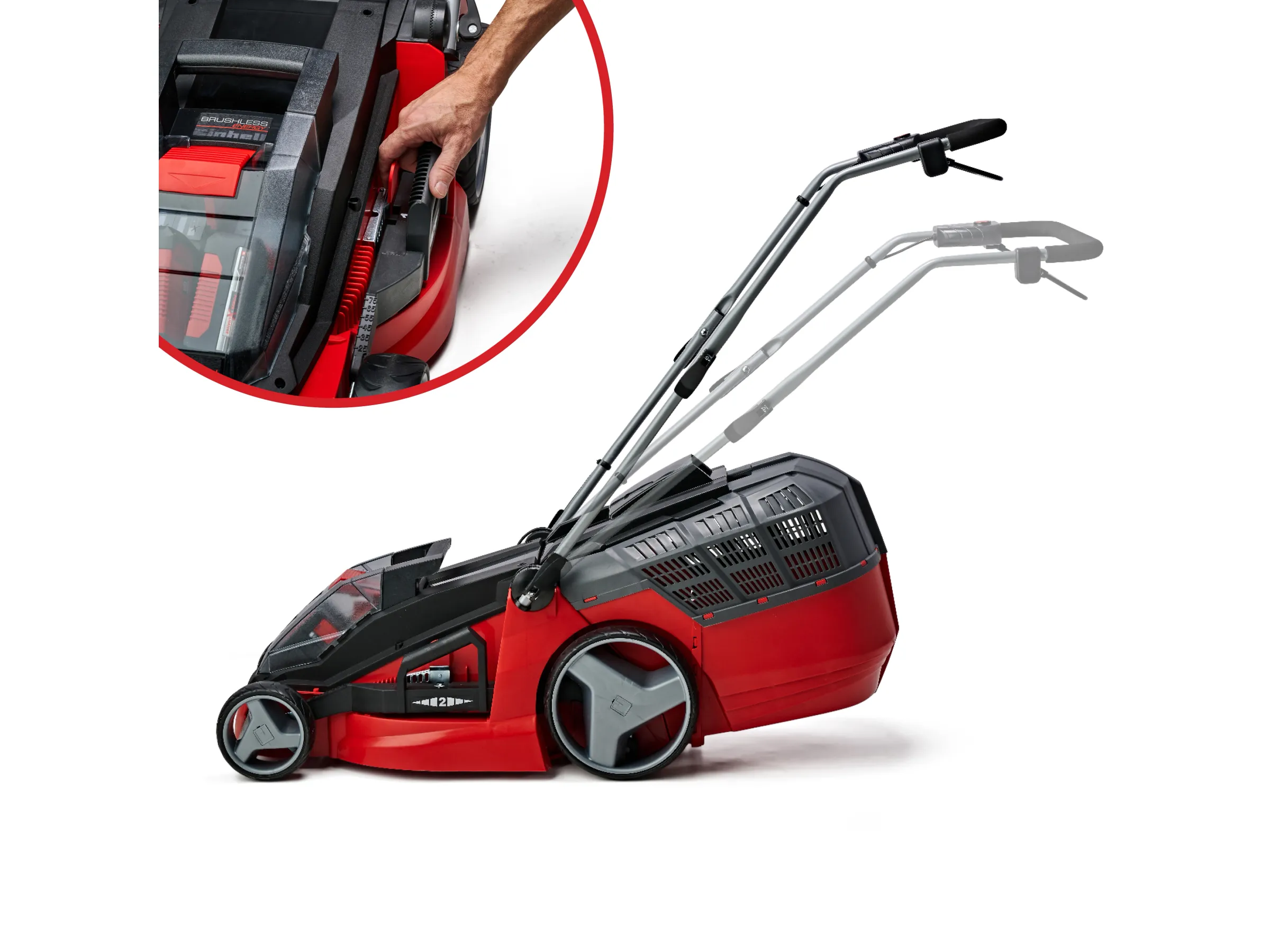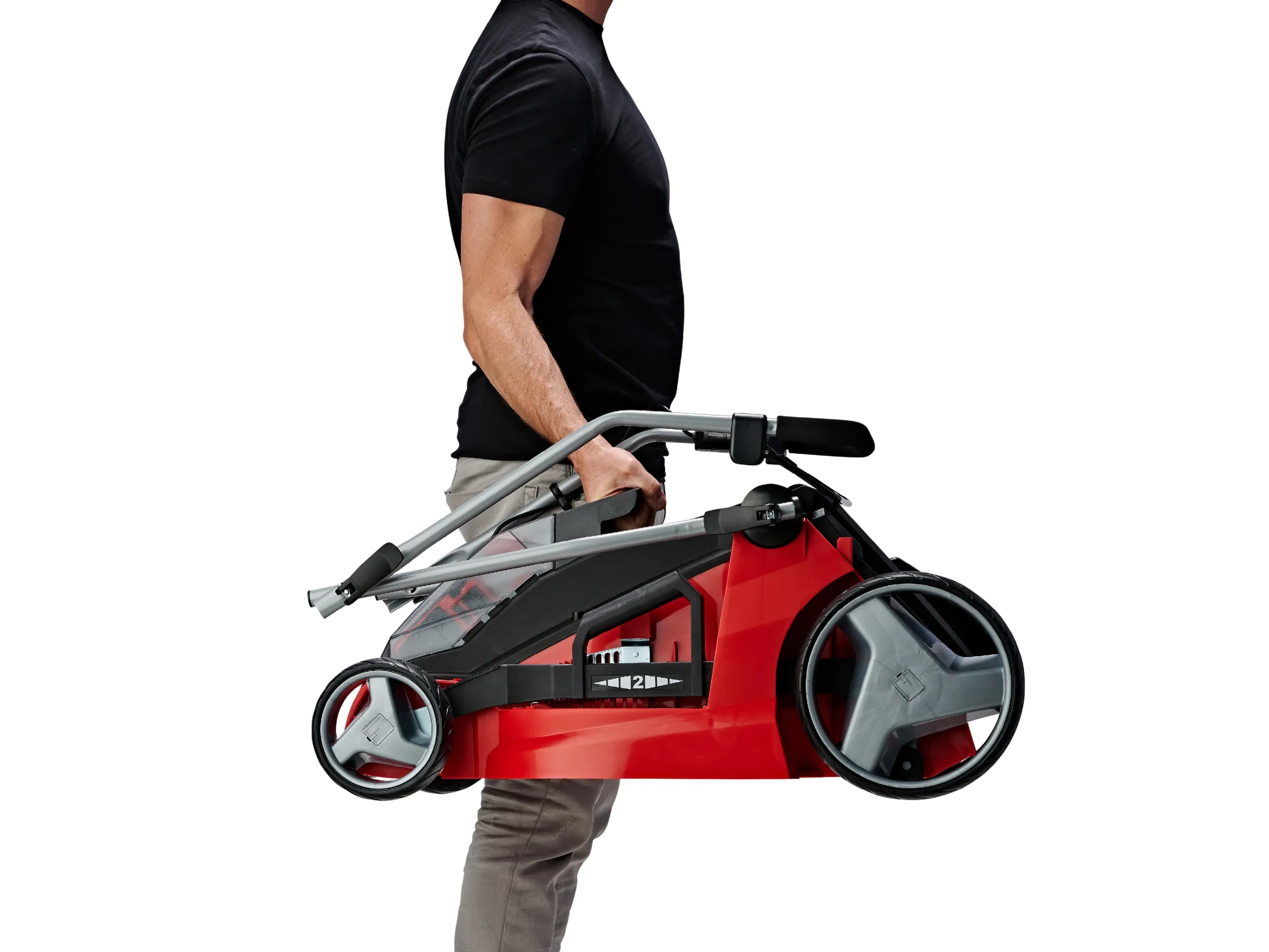 Als Highwheeler verfügt der Rasenmäher über erhöhte Hinterräder, die das Schieben in anspruchsvollem Gelände erleichtern. Der klappbare Führungsholm ermöglicht eine platzsparende Lagerung und lässt sich in der Höhe individuell auf den Verwender einstellen. Der schlanke Griff ist mit einer Gummierung versehen und verfügt daher über eine hervorragende Haptik. Dank des praktischen Tragegriffs lässt sich der Rasenmäher zudem einfach transportieren. Für eine sichere Verwendung sorgt der zusätzliche Totmannschalter, der für das sofortige Ausschalten des Motors sorgt, sobald dieser losgelassen wird.