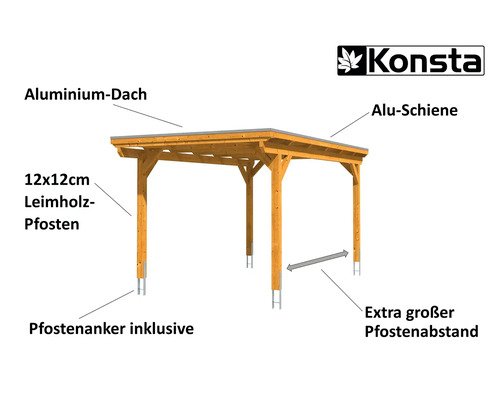 Die Einzelcarport Konsta Aluminium Dachplatten ist aus Leimholz gefertigt. Dieses besteht aus mehreren getrockneten, der Länge nach durch Keilzinkung verbundenen Lagen. Diese werden übereinander wetterfest verleimt. So entsteht ein tragfähiger Balken der gegenüber natürlich gewachsenem Holz verwindungsärmer ist und weniger zur Rissbildung neigt.