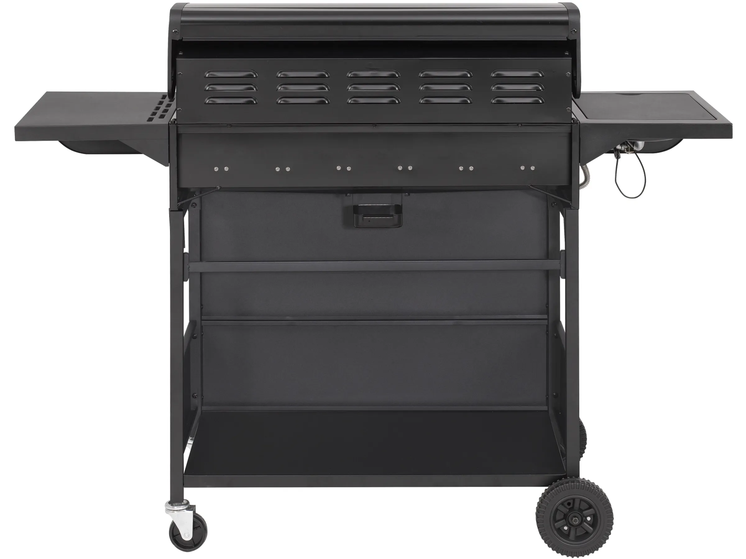 Zwei stabile Seitentische geben ausreichend Platz für Grillwerkzeug, Teller, Zutaten oder Gewürze. Einer der Tische ist so positioniert, dass man bequem arbeiten kann, während der Grill läuft. Unterhalb des Grillbereichs befindet sich ein großer Unterschrank mit Türen, der nicht nur die Gasflasche sicher beherbergt, sondern auch Stauraum für Grillbesteck, Bürsten oder Reinigungsutensilien bietet. Rollen am Untergestell machen den Grill mobil, und eine Feststellfunktion an den Rädern garantiert sicheren Stand während des Grillbetriebs.