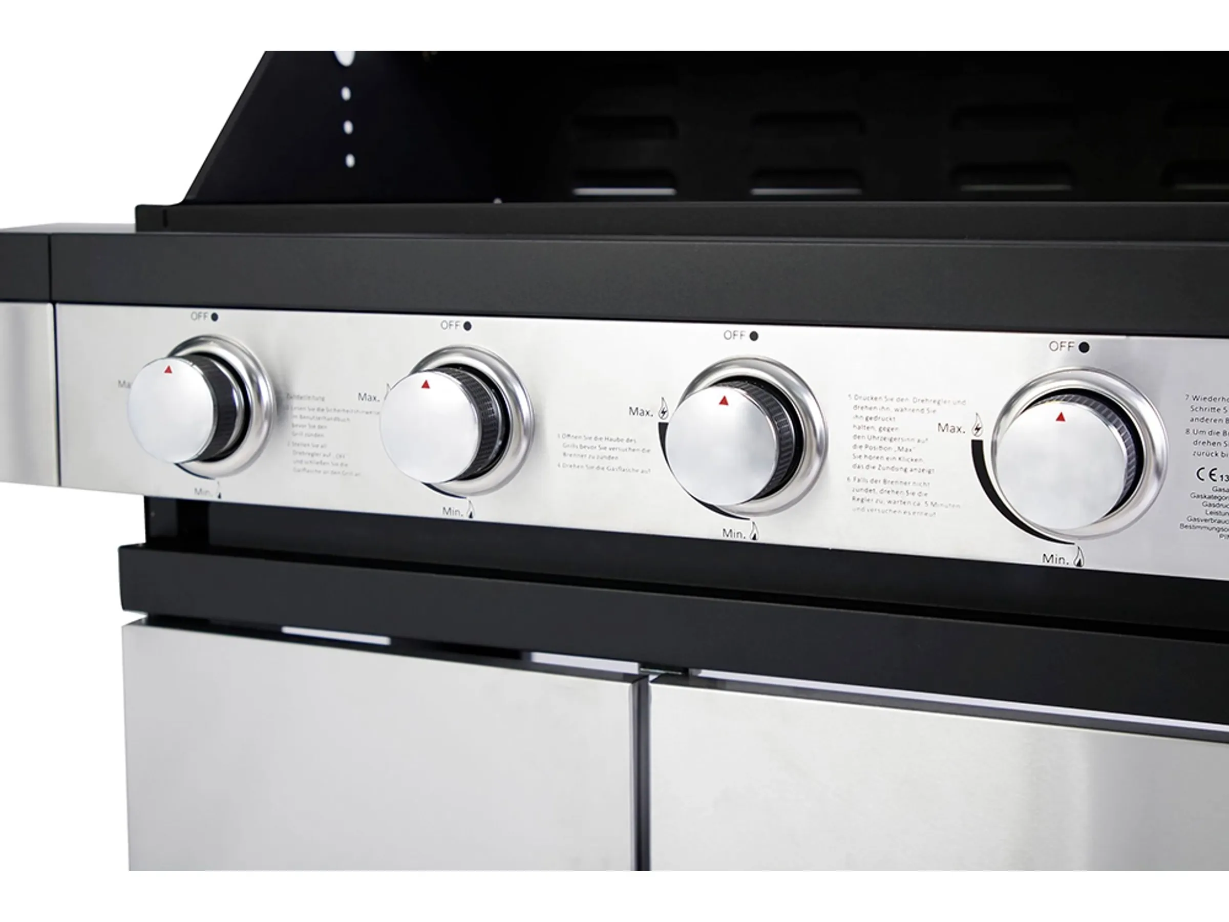 Leistung: ca. 13,7 kW (4 Hauptbrenner je 2,8 kW + 1 Seitenbrenner 2,5 kW)