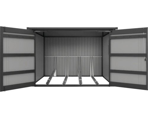 Dank der komfortablen Größe können Sie problemlos bis zu 4 Fahrräder unterbringen und haben zusätzlich noch die Möglichkeit, Helme oder Werkzeug an den im Lieferumfang enthaltenen S-Haken aufzuhängen. Hierfür finden Sie an den Tür-Flügeln entsprechende Geräteleisten.