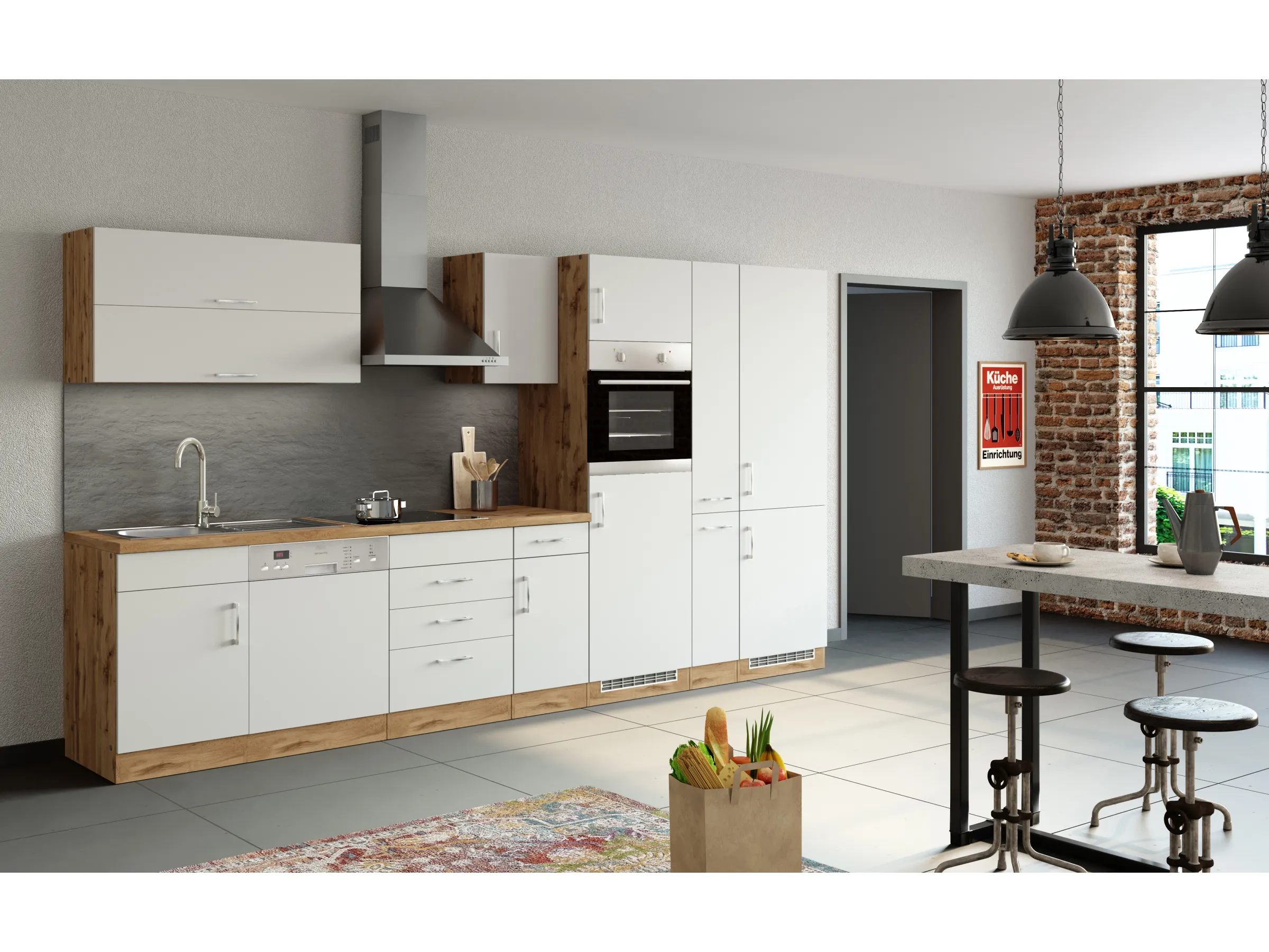 Die Küchenzeile wird Ihnen zerlegt und ohne Dekoration geliefert. Die Anordnung der Küchenelemente und die Anschläge der Türen sind somit für Sie frei wählbar. Die Arbeitsplatte wird ohne Ausschnitte geliefert. Technische Änderungen und Irrtümer vorbehalten