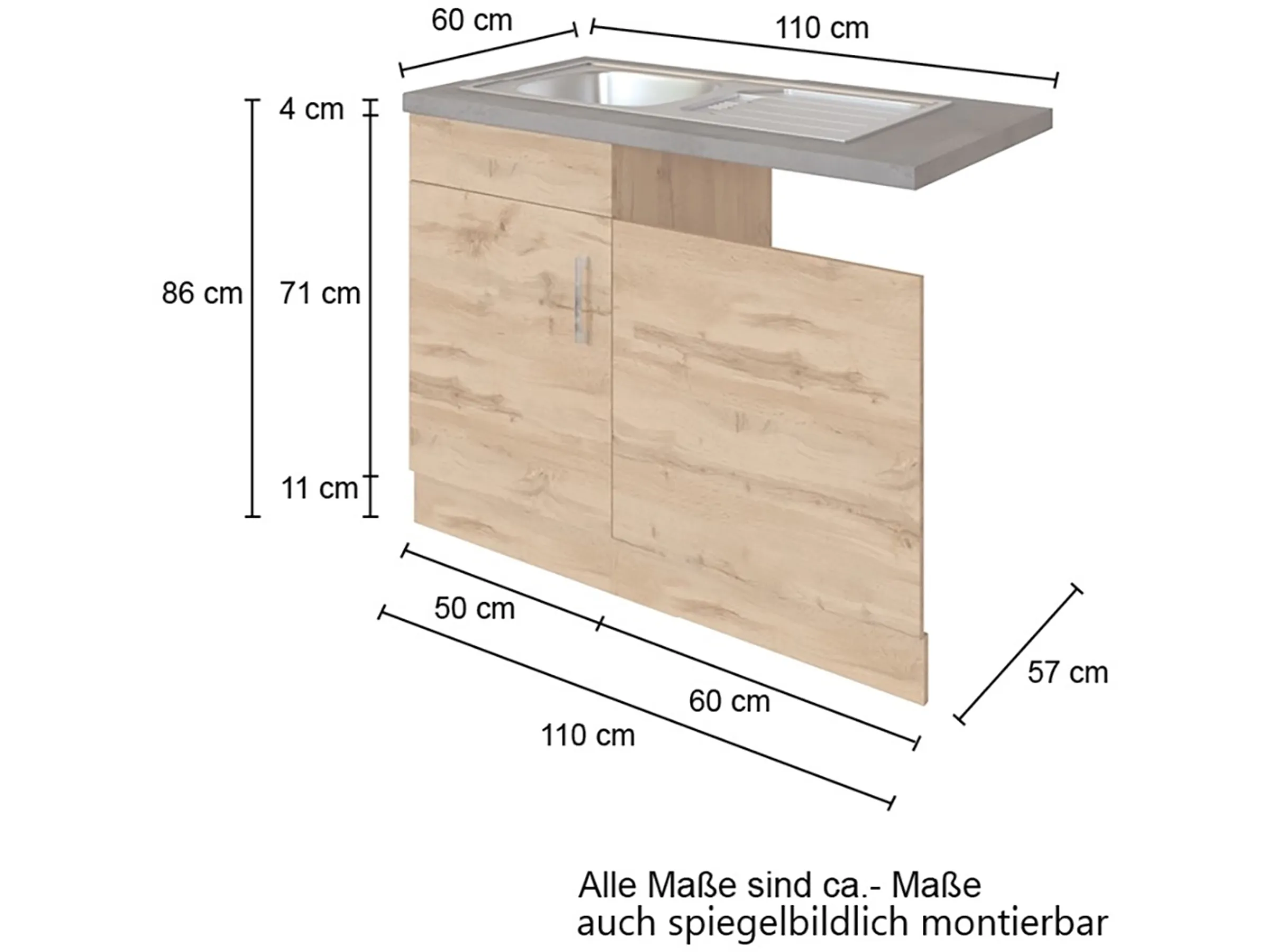 Das Held Möbel Spülzentrum Sorrento misst B x H x T: 110 cm x 85 cm x 60 cm, 1 Tür für Geschirrspüler teil – integriert, Arbeitsplatte ohne Ausschnitt, Einbauspüle B x T: 86 cm x 43,5 cm, Beckenmaße B x H x Beckentiefe: 37 cm x 34 cm x 14 cm, Metallgriff