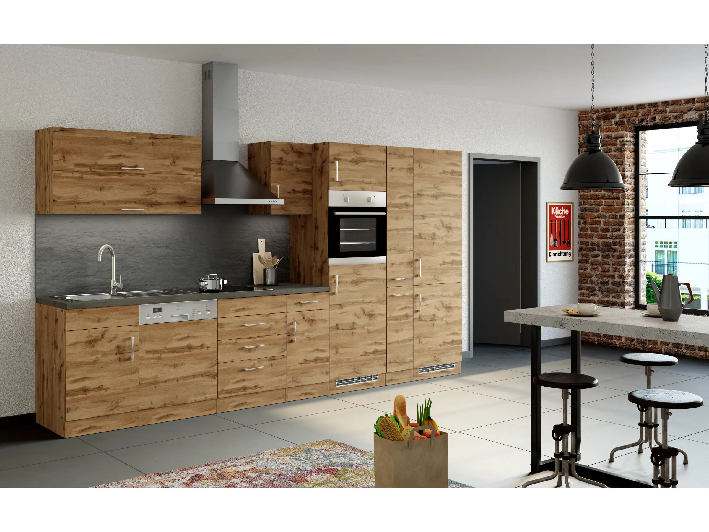 Die Küchenserie Sorrento besticht durch ihre 4 absolut trendstarken Dekorkombinationen, in denen immer das ausdrucksstarke Eichedekor eine entscheidende Rolle spielt. Durch eine Vielzahl an Zeilen- und Winkelkombinationen, die außerdem durch eine große Auswahl an Ergänzungsmöbeln komplettiert werden, ergibt sich ein breites Spektrum an Einrichtungsmöglichkeiten. Möchten Sie Ihren Backofen lieber autark in einem Hochschrank untergebracht haben? Benötigen Sie einen großzügigen Kühlschrank mit integriertem Gefrierschrank? Lagern Sie Ihre Vorräte gern in Auszügen und Apothekerschränken? Alle Schränke sind flexibel aufzustellen und die Türen sind wahlweise rechts oder links montierbar. Entscheiden Sie selbst- hier bleiben keine Wünsche offen.