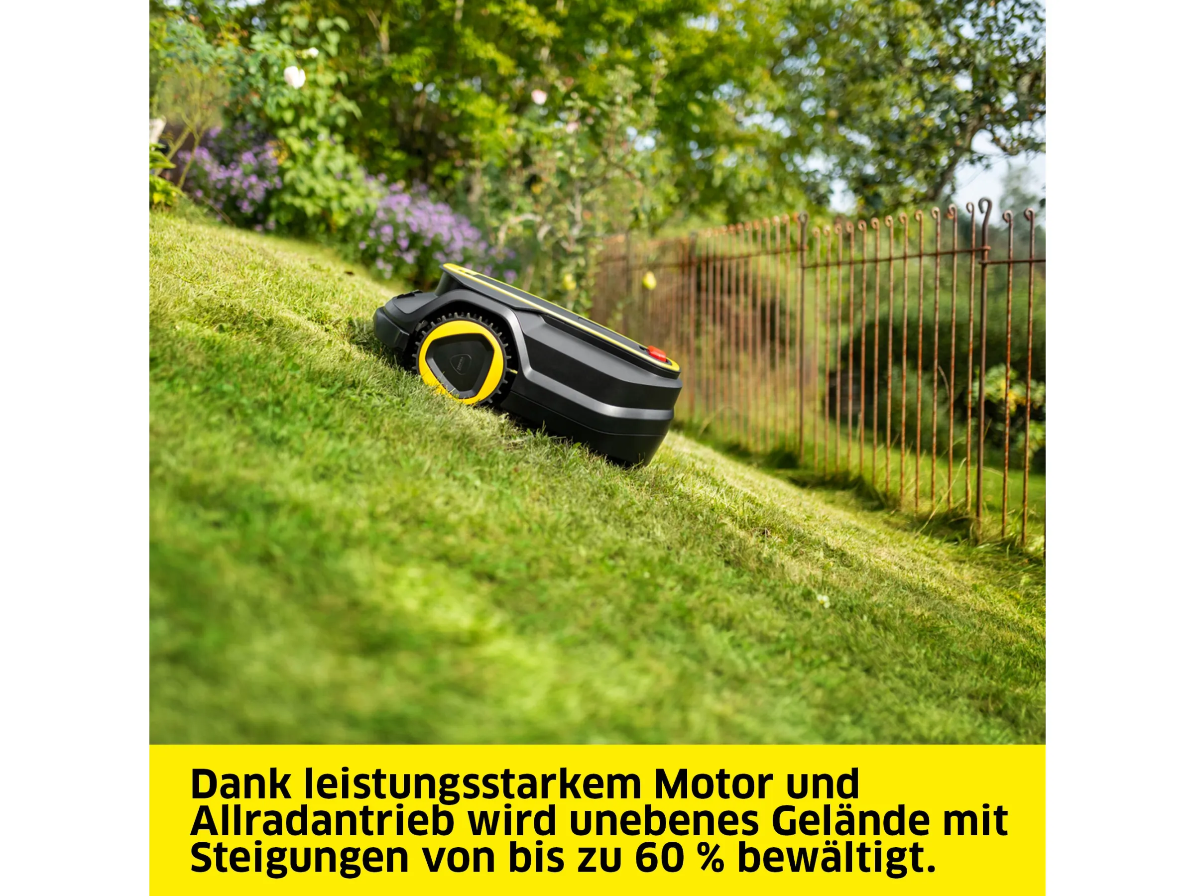 Der Kärcher RCX 4 Mähroboter ist darauf ausgelegt, sowohl kleine als auch größere Flächen effizient zu bearbeiten. Seine Antriebstechnik ermöglicht das sichere Befahren von leichten Steigungen, ohne an Traktion zu verlieren. Auch unebene Flächen werden zuverlässig gemäht.