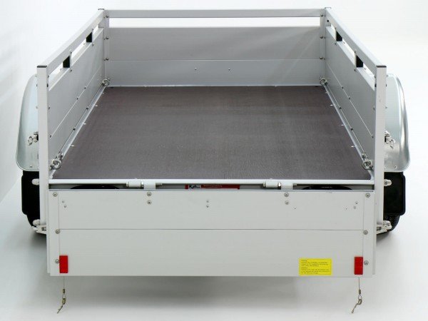 Der Anhänger verfügt über einen robusten, verzinkten Stahlrahmen, der optimal vor Korrosion schützt und eine lange Lebensdauer gewährleistet. Die stabile Achskonstruktion sorgt für eine sichere Straßenlage, auch bei voller Beladung. Eine rutschfeste Ladefläche erleichtert das Be- und Entladen und trägt zusätzlich zur Sicherheit bei. Die klappbare Heckklappe ermöglicht den einfachen Transport von längeren Gütern.