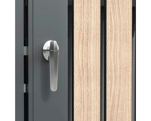 Zeitloses Design durch die Kombination von dunkelgrauem Stahl in Kombination mit Holzoptik