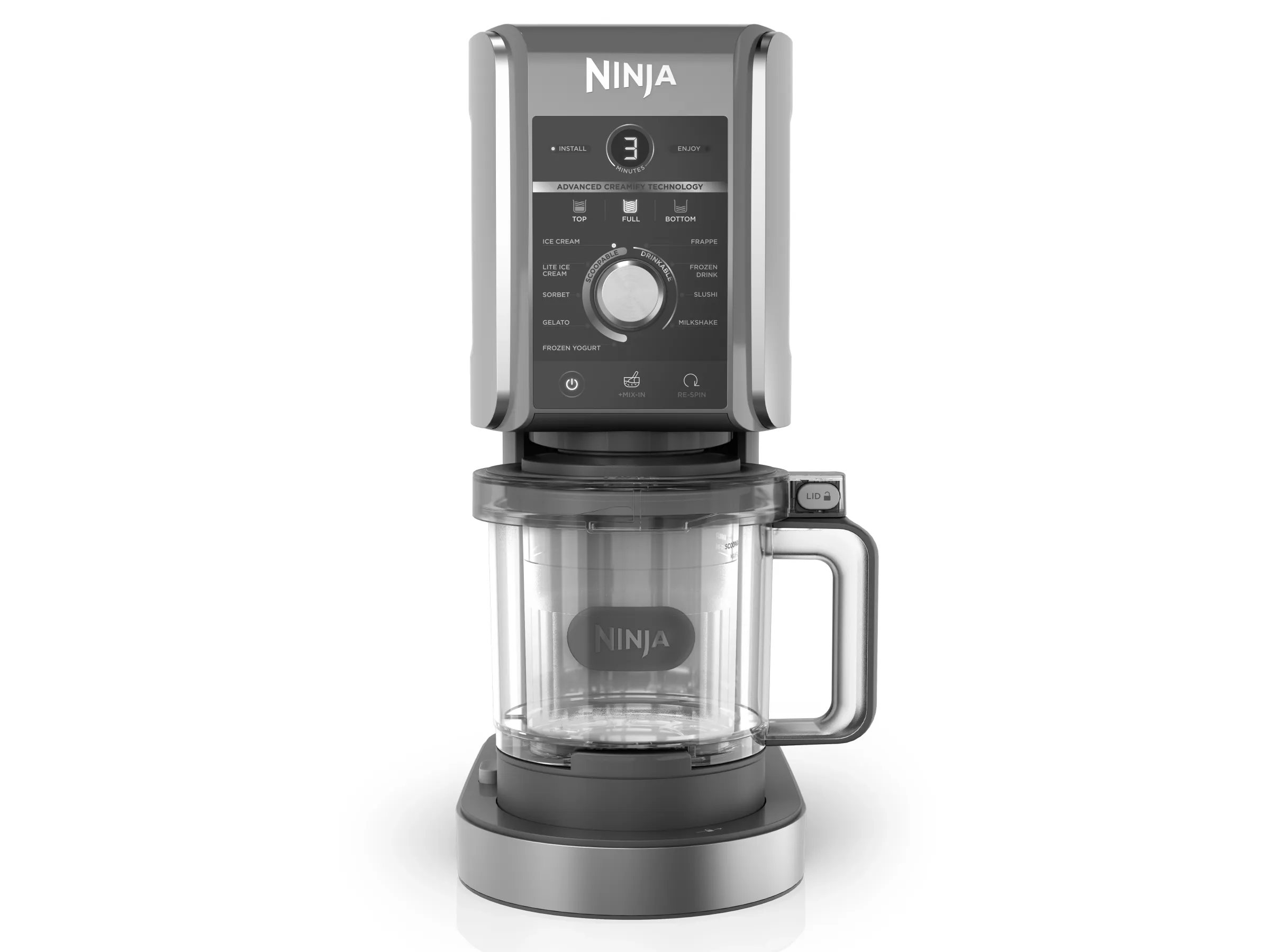 Die CREAMi Deluxe verwendet fortschrittliche CREAMify-Technologie, bei der die Dual-Drive-Motoren Druck ausüben und den professionellen Creamerizer-Paddle drehen, um Eispartikel zu feinen, köstlichen Leckereien wie Slushies, gefrorenen Getränken, Frappes und mehr zu verarbeiten.