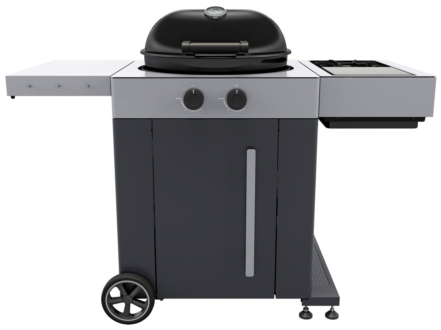 Das Modell Evo Plus ist im Vergleich zum Modell Evo direkt mit der, normalerweise optionalen, Blazing-/ Cooking Zone ausgestattet. Das große Seitenteil beinhaltet einen Infrarotbrenner für Temperaturen von bis zu 900°C sowie einen Seitenkocher für die Nutzung mit Töpfen und Pfannen.