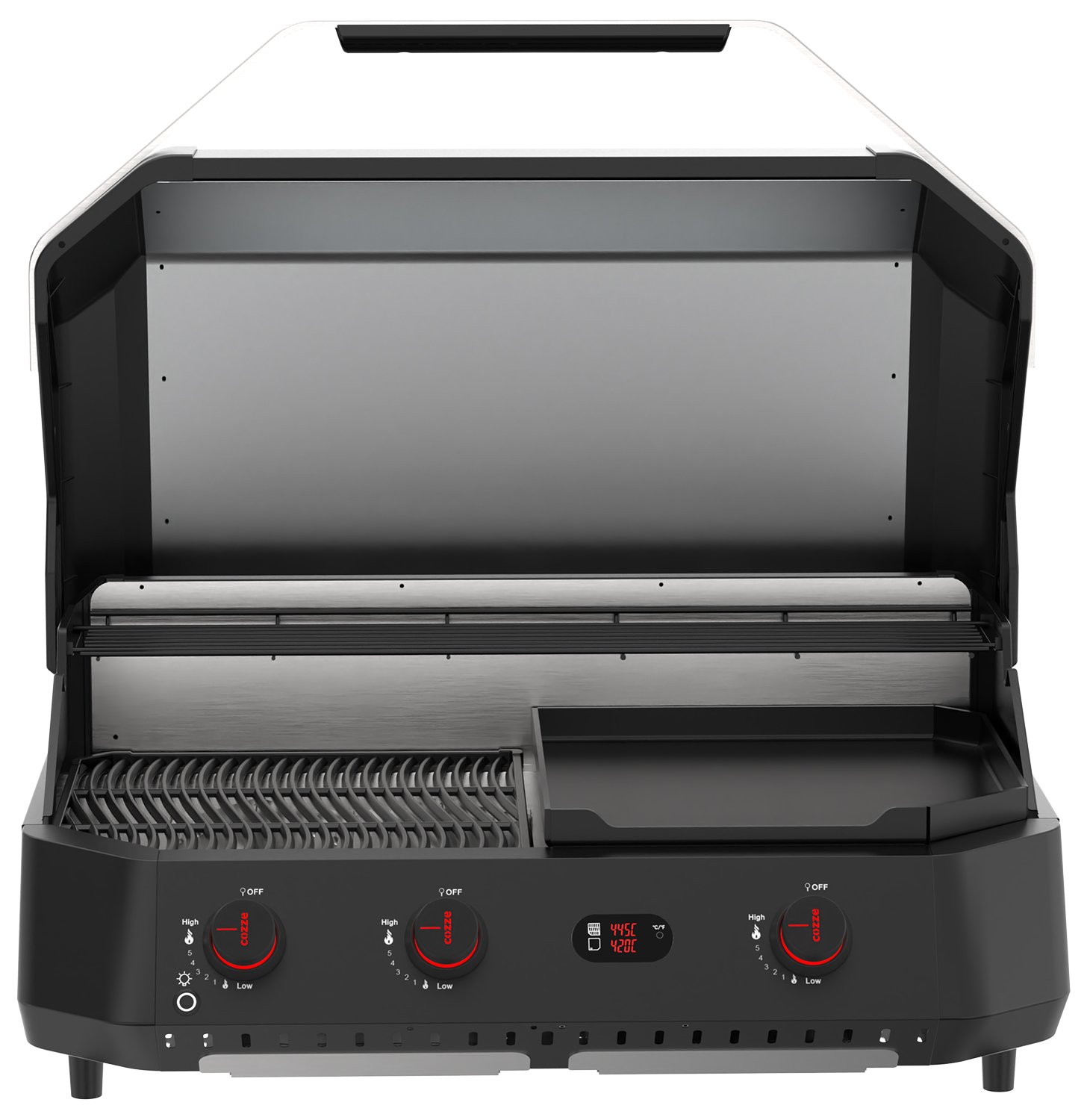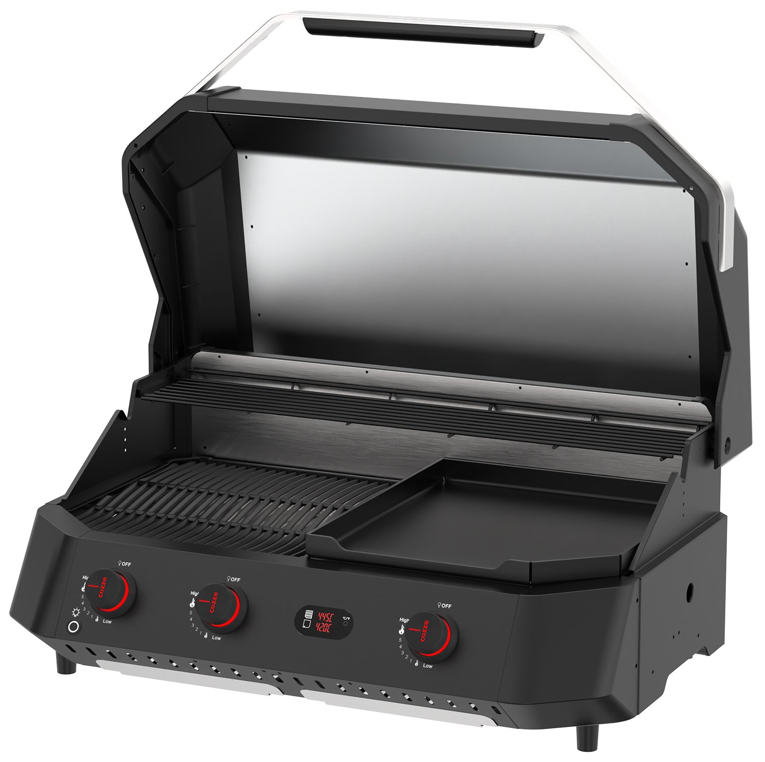 Ausgestattet mit einem Grillrost auf der einen und einer Plancha auf der anderen Seite sowie 3 separat regulierbaren, leistungsstarken U-Brennern ermöglicht der COZZE G-800 die Zubereitung der verschiedensten Gerichte in unterschiedlichen Temperaturzonen gleichzeitig. Grillen Sie zum Beispiel auf dem Grillrost saftige Steak mit satten Brandings, während auf der Plancha Ihr Grillgemüse zeitgleich optimal gart.