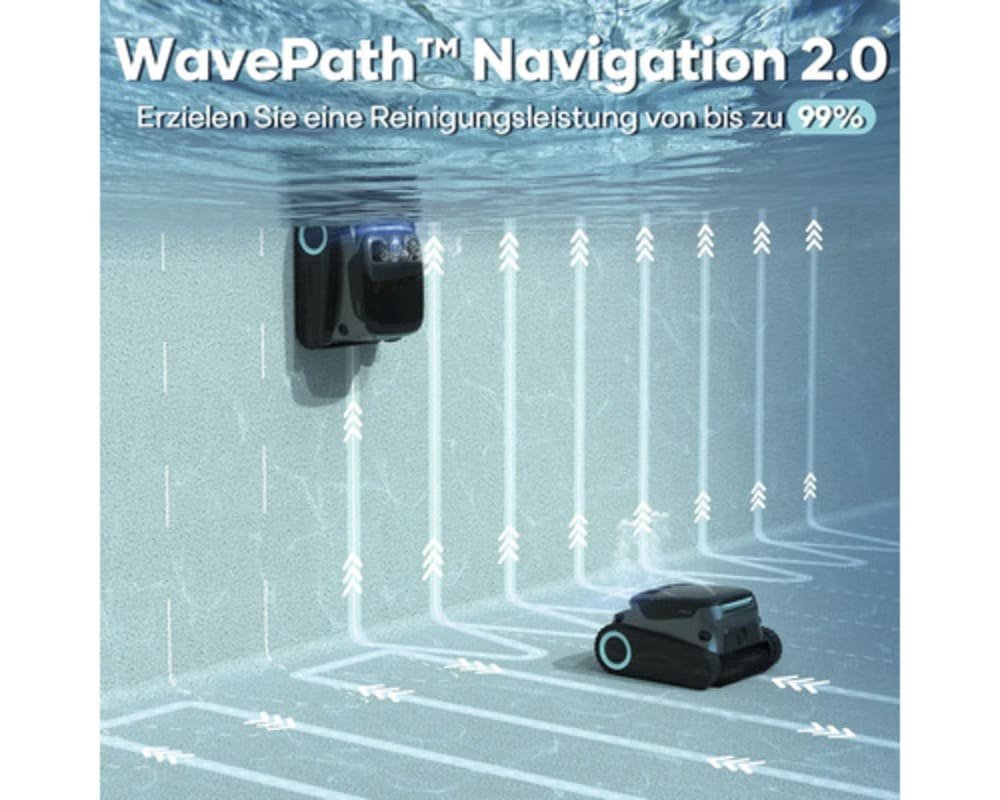 WavePath Navigationstechnologie 2.0: Mit der modernsten Technologie von Aiper erhöht der Scuba S1 Pro die Reinigungsabdeckung um 99% im Vergleich zu anderen Poolstaubsaugern. Hochentwickelte Sensoren bestimmen präzise die Position des Geräts, um eine vollständige Reinigung von Boden, Wänden und Wasserlinie zu gewährleisten.
