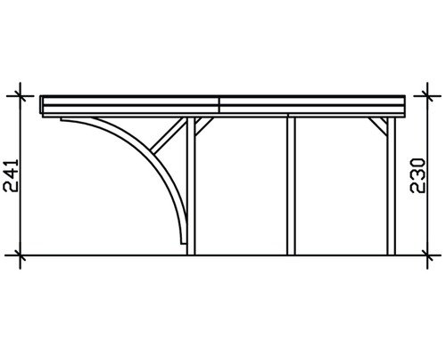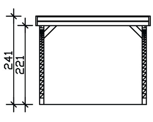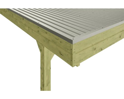 Das SKAN HOLZ Flachdach-Carport Friesland verfügt über 11,5 x 11,5 cm starke Pfosten inkl. H-Pfostenanker zum Einbetonieren. Die Dacheindeckung besteht aus Aluminium-Dachplatten mit Trapezprofil. Der Dachabschluss besteht aus einer Profilholzblende mit Aluminium-Abschlusskante. Das Gefälle verläuft nach hinten. Bausatz komplett mit 2 Einfahrtsbögen sowie Montagematerial und Aufbauanleitung.
