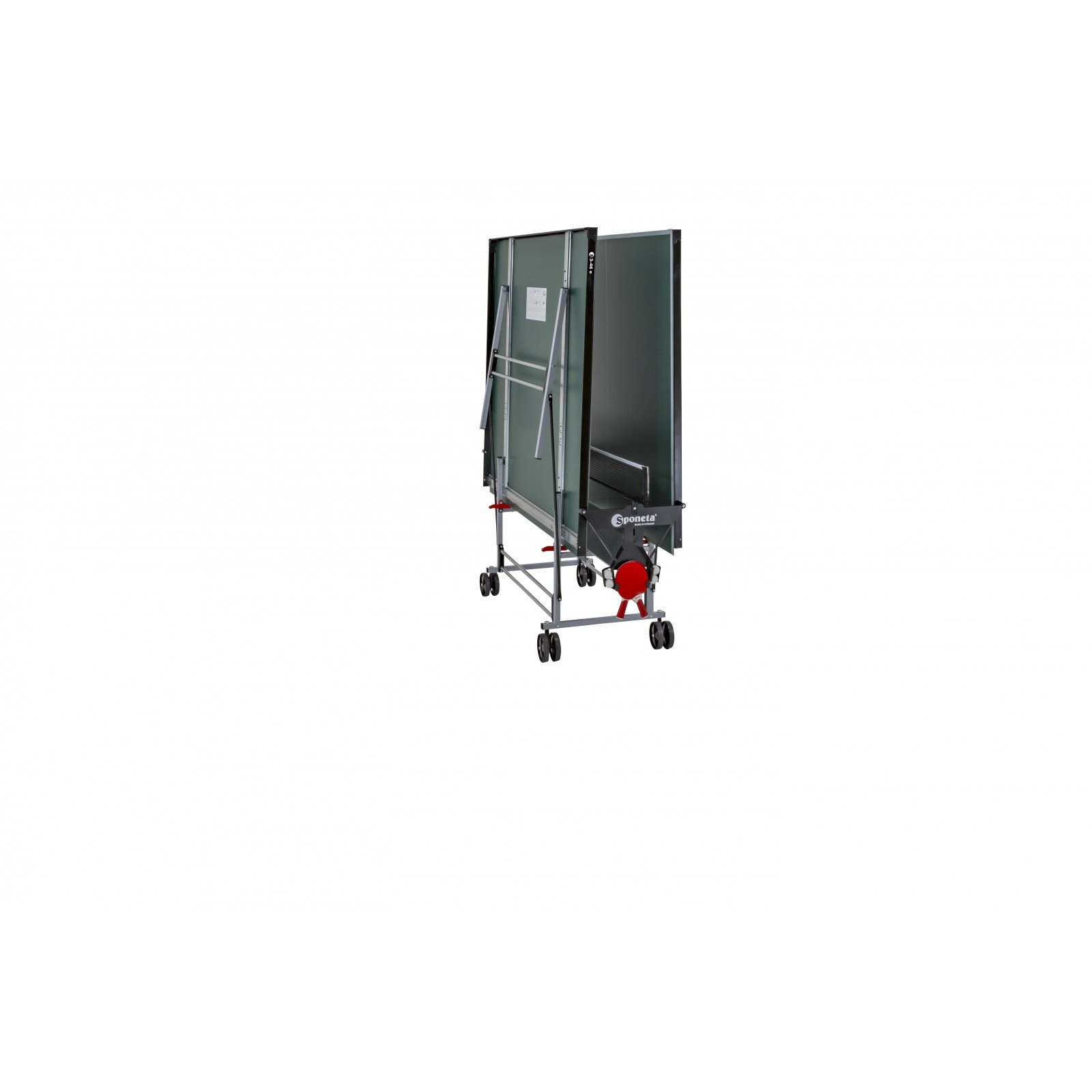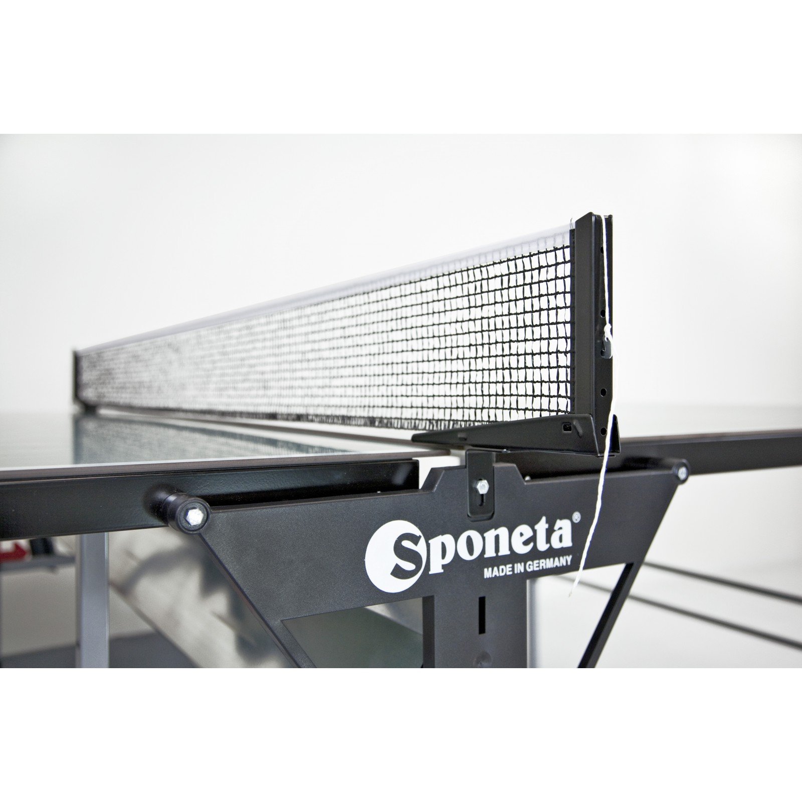 Zusätzlich bietet die Sponeta Outdoor gute Ballsprungeigenschaften bei hoher Stabilität und Sicherheit. Erwähnenswert ist hierbei vor allem das Hakensystem beim Hochklappen der Sponeta-Tischtennisplatte: Mit dem Anheben des Hakens auf einer Seite und dem gleichzeitigen leichten Ziehen an der Spieloberfläche wird die erste Verriegelung entriegelt. Der zweite Verriegelungsmechanismus kann auf die gleiche Art gelöst und dadurch die Spieloberfläche von der Abstell- in die Spielposition gebracht werden. Das Zusammenklappen der Sponeta Outdoor von der Spiel- in die Abstellposition erfolgt ohne weitere Entriegelung. Dazu hebt man lediglich die Oberflächen an und bringt sie in senkrechte Stellung, bis die Verriegelungen hörbar einrasten. Die Standsicherheit der Tischtennisplatte gegen Druck oder Zug wird durch die permanent angebrachte Netzgarnitur gewährleistet.