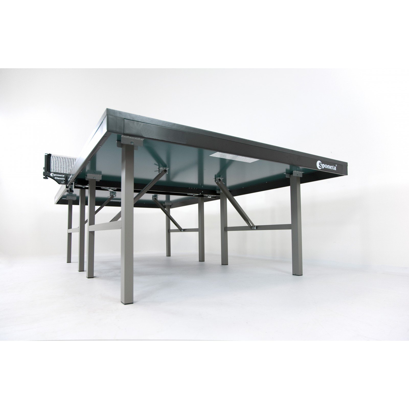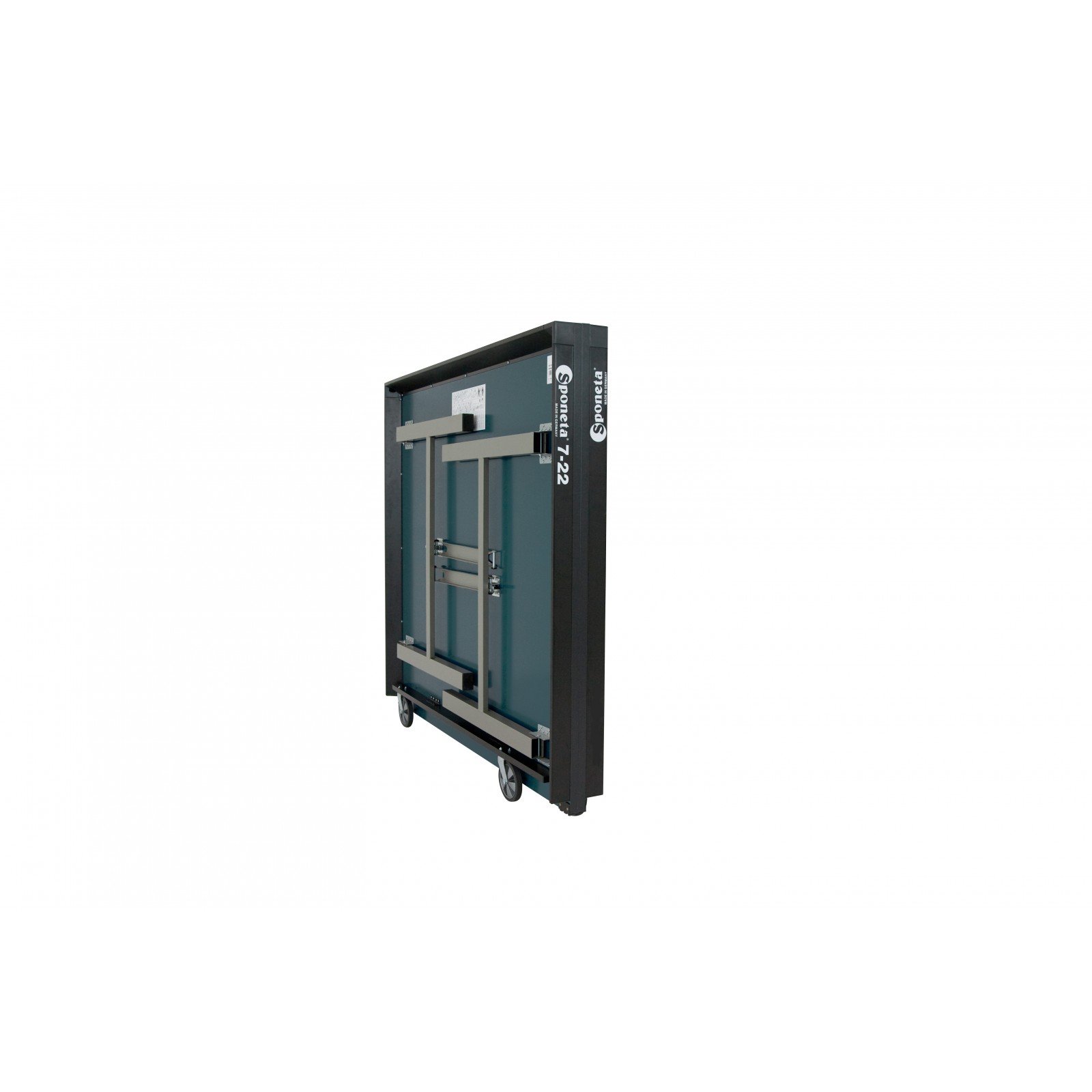 Die Sponeta Tischtennisplatte S7-22/S7-23 gehört zu den Indoor-Tischtennisplatten der Sponeta Profiline. Der Sponeta Tischtennisplatte S7-23 besitzt an den Standfüßen keine Transportrollen. Bei dieser Tischtennisplatte sind an der Unterseite der einzelnen Platten Rollen befestigt mit denen die Plattenhälften bewegt werden können. Der große Vorteil daran ist, dass die Platte sehr platzsparend gelagert werden kann.