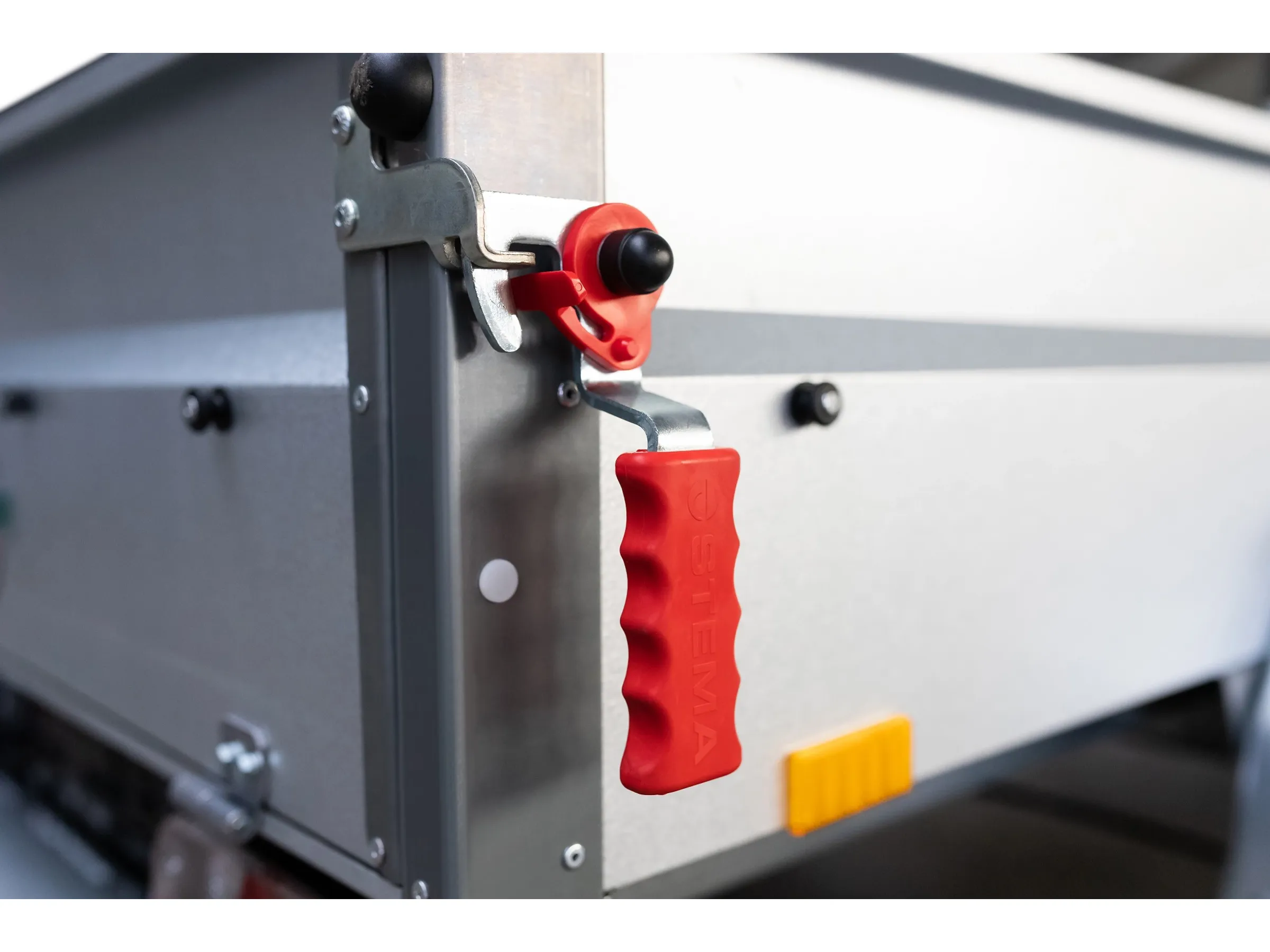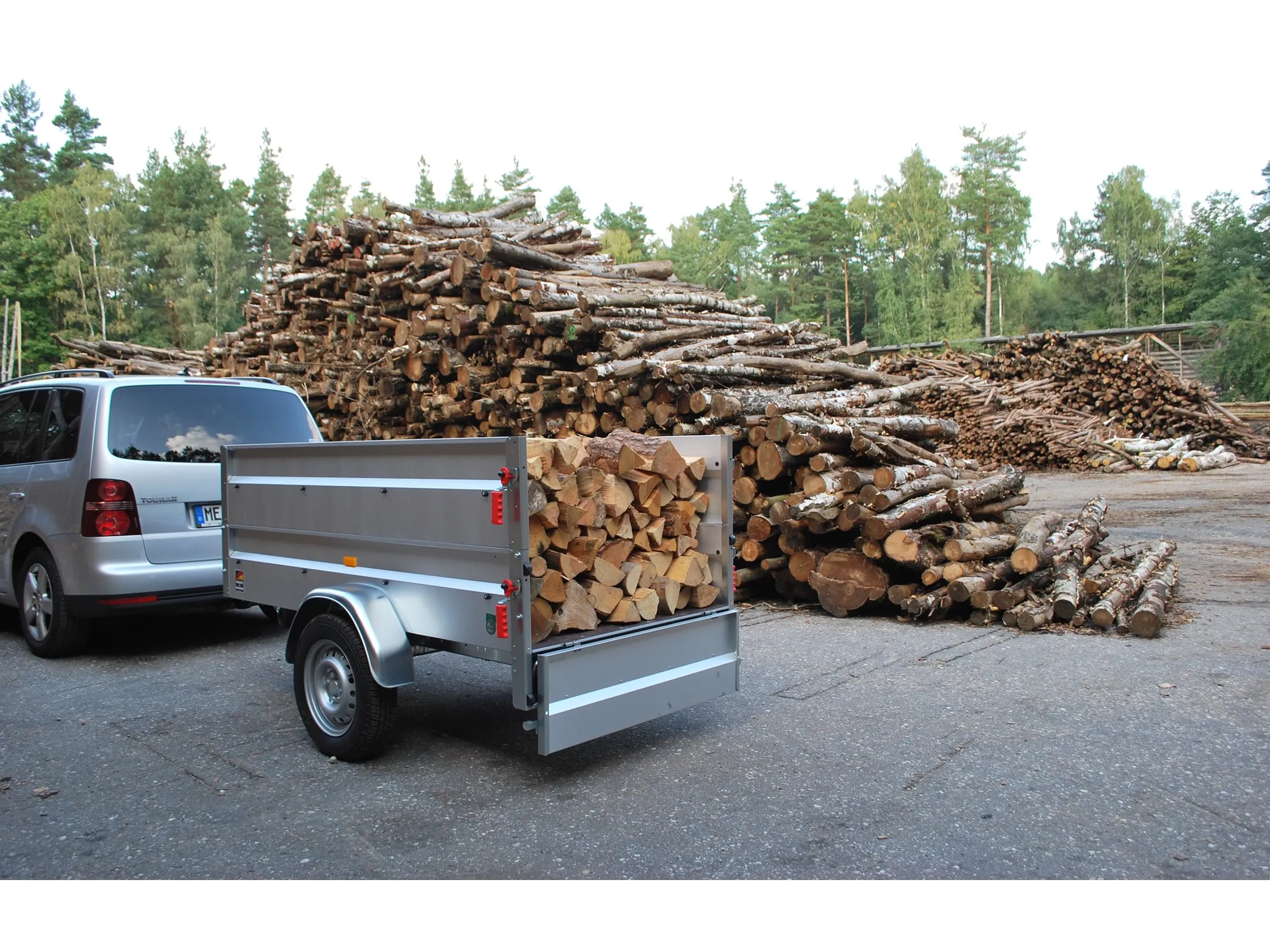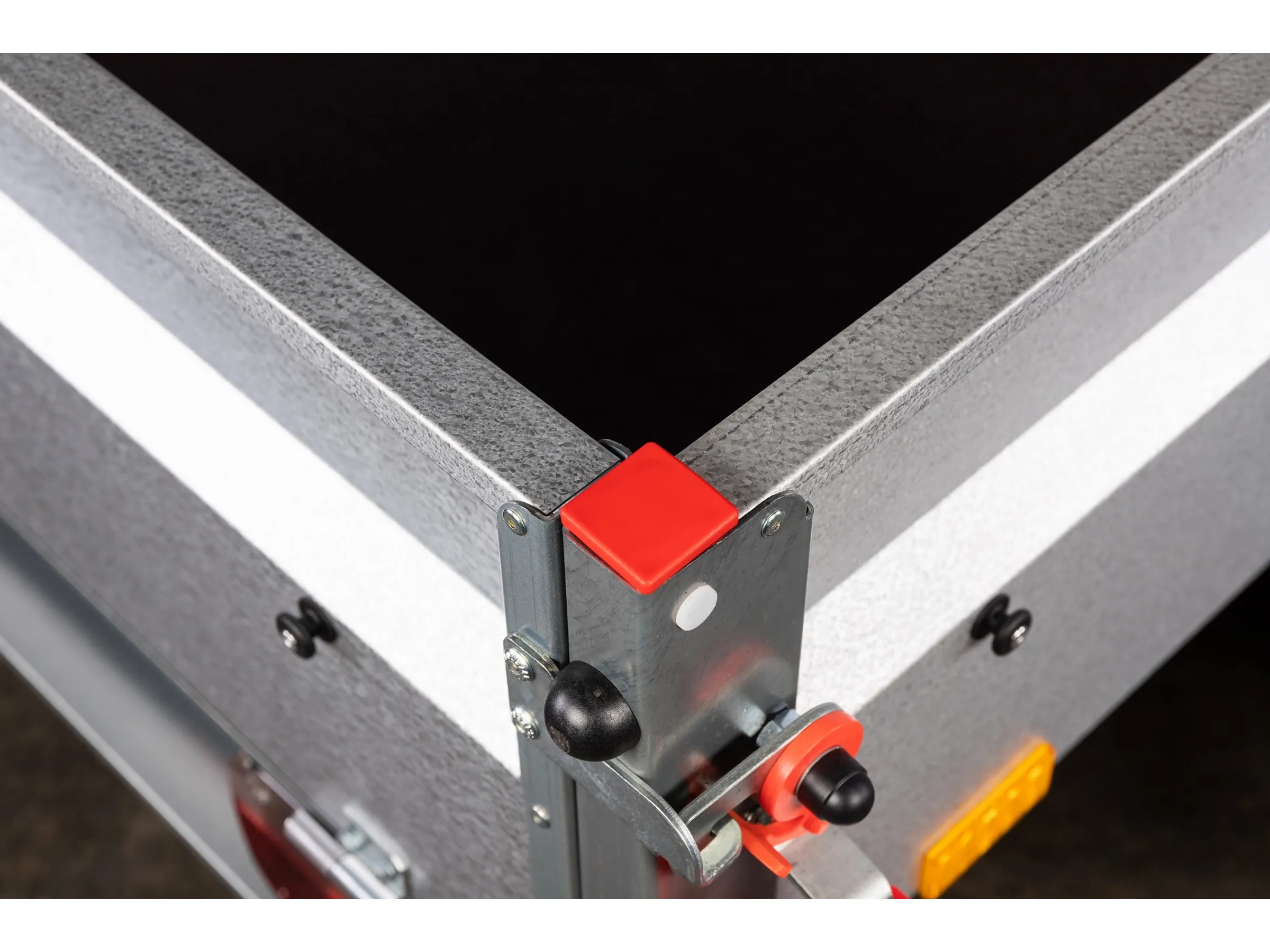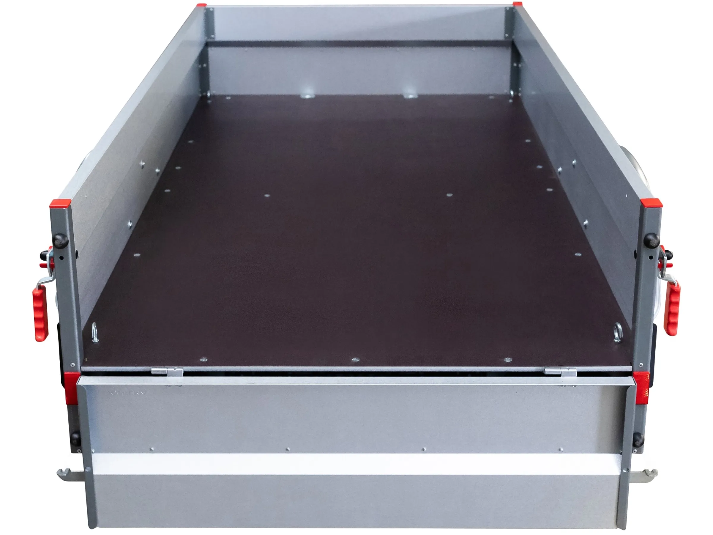 Die 33 cm hohen Bordwände haben eine Aluminium-Zink-Spezialbeschichtung. Die Rückwand des Basic 750 ist klapp- und aushängbar und mit stabilen Winkelhebelverschlüssen zu verriegeln. Durch den 36 cm hohen Bordwandaufsatz wird ein größeres Ladevolumen erreicht. Die Flachplane bietet zusätzlichen Witterungsschutz der Transportgüter.