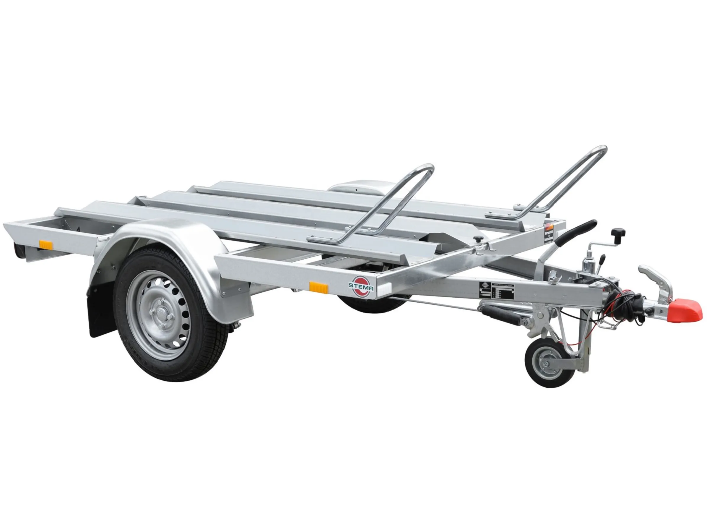 Der gebremste Stema Motorradtransporter Classic MT 850 BS 2 ist ein einachsiger Tieflader mit einem maximalen zulässigen Gesamtgewicht von 850 kg und einer Nutzlast von 680 kg. Der Anhänger eignet sich hervorragend zum Transport von 2 Motorrädern.