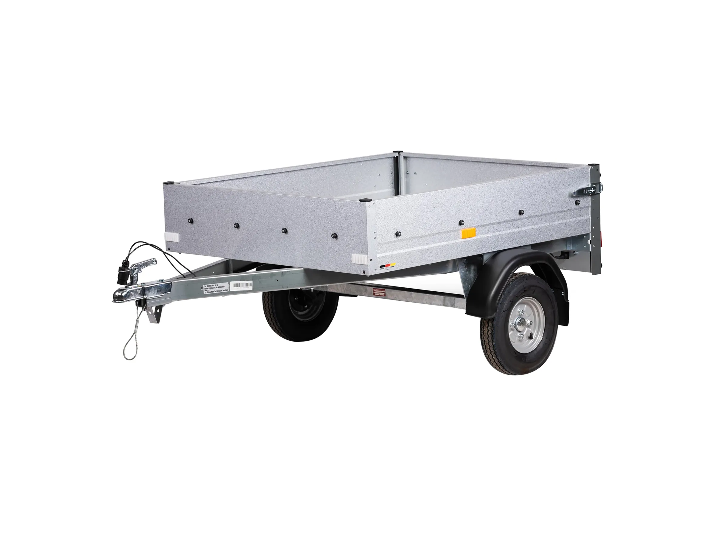 Der Autoanhänger ist mit Multifunktionsleuchten inkl. Nebelschlussleuchte und einem Rückfahrscheinwerfer ausgestattet. Dank der mit einer speziellen Galvalume-Beschichtung versehenen Bordwände und des feuerverzinkten Stahlgestells ist der Anhänger unemfpindlich gegenüber Witterungseinflüssen. Der Boden besteht aus wasserfest verleimtem Mehrschichtholz mit einer speziellen phenolharzbeschichteten Oberfläche, die rutschhemmend ist. Zur weiteren Sicherheit wird der Anhänger mit V-Deichseln ausgestattet.