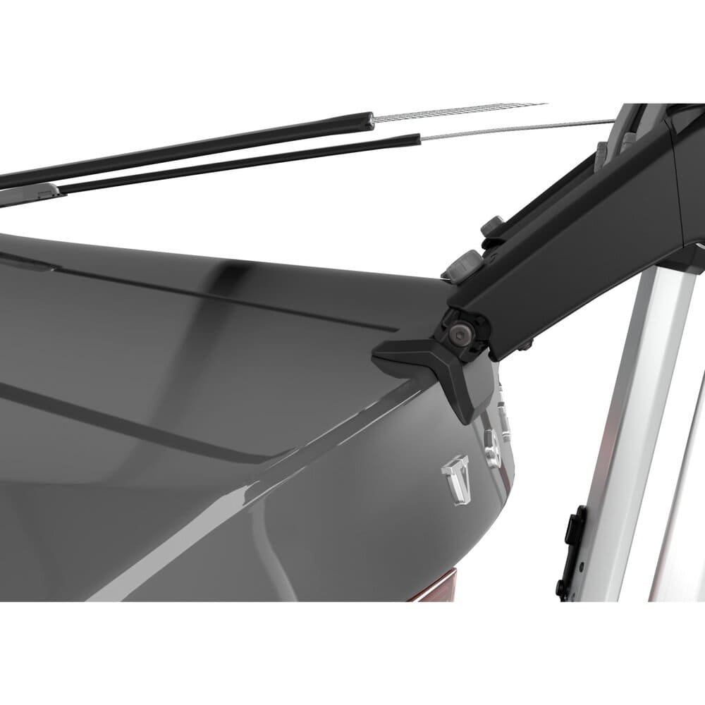 - Einfache Befestigung der Fahrräder mit verstellbaren/abnehmbaren Fahrradhaltearmen und Thule AcuTight Drehmomentbegrenzer-Knöpfen, die klicken, wenn das optimale Drehmoment erreicht ist