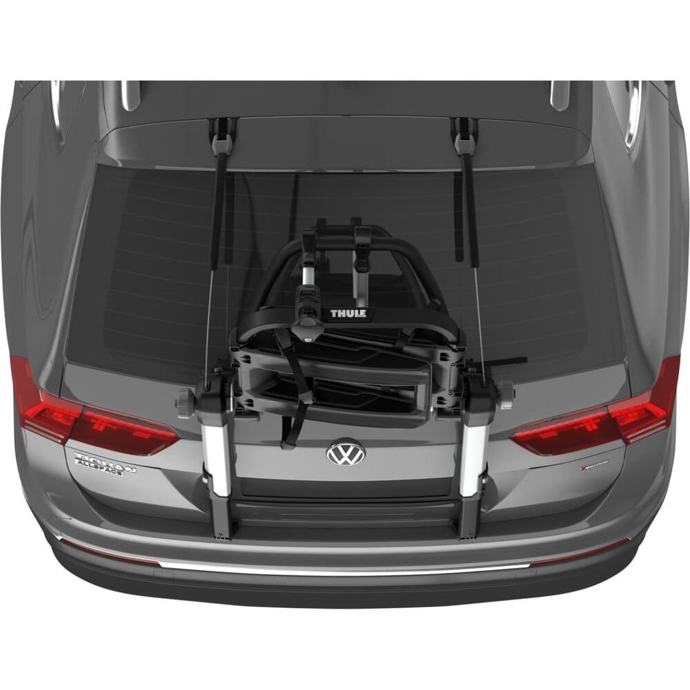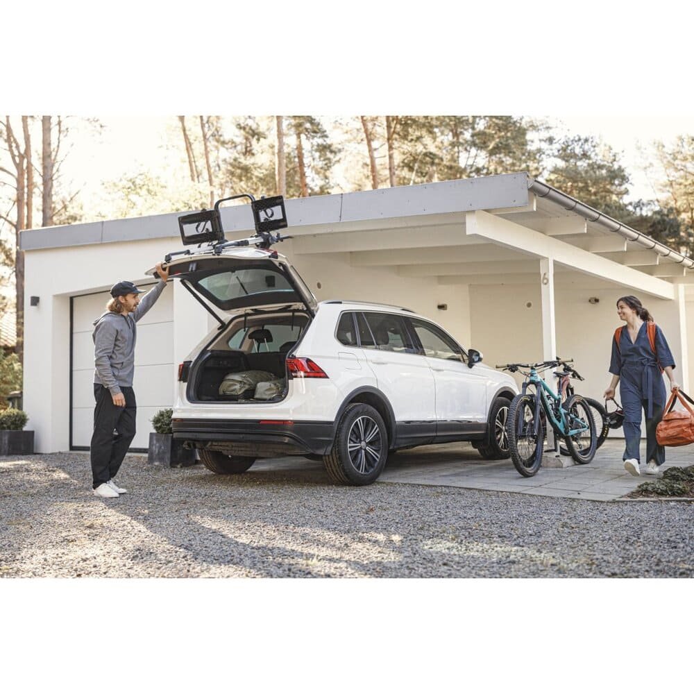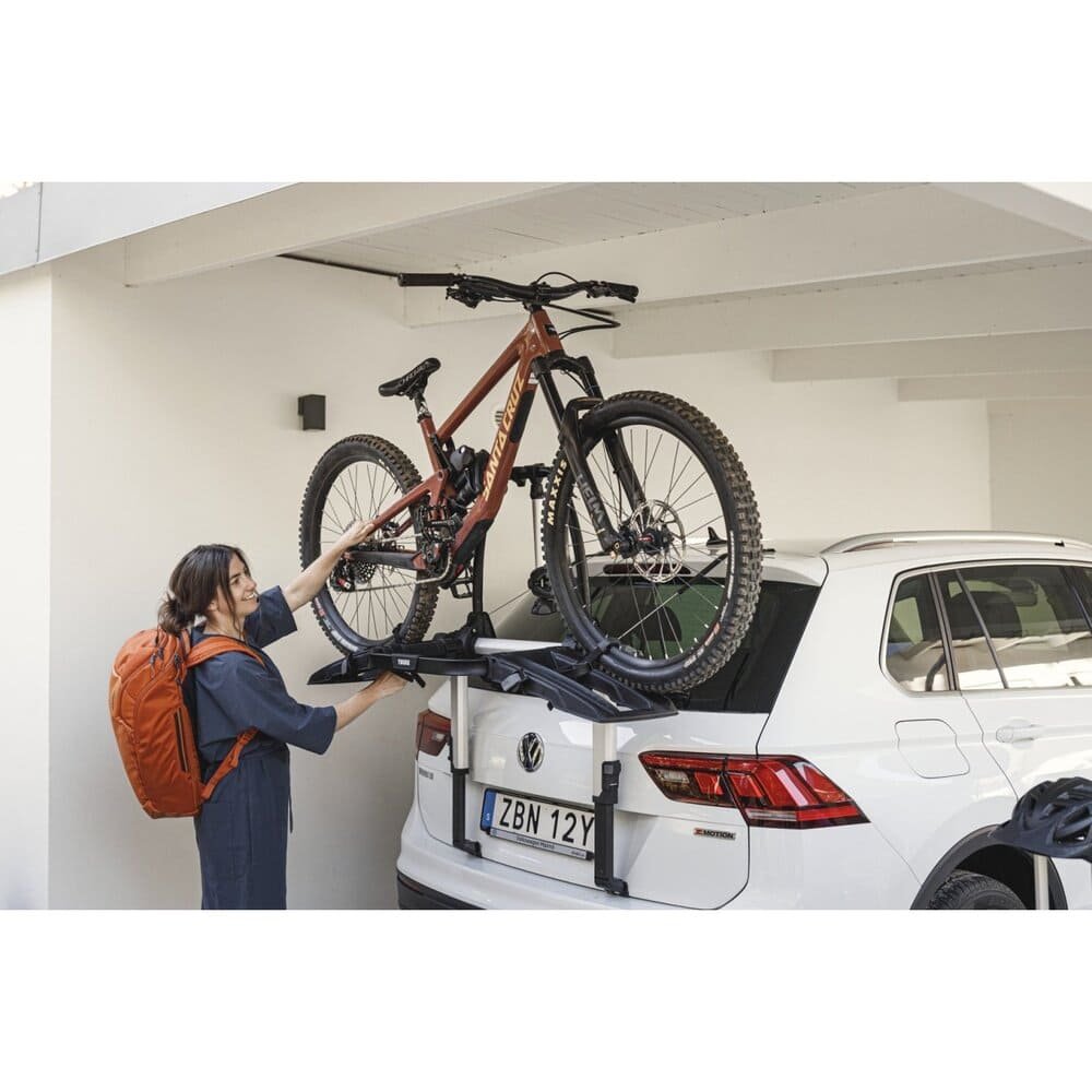 Thule Fahrradträger für unkomplizierte Ausflüge mit erhöhter Plattform, bei der die Rückleuchten und das Kennzeichen sichtbar bleiben.