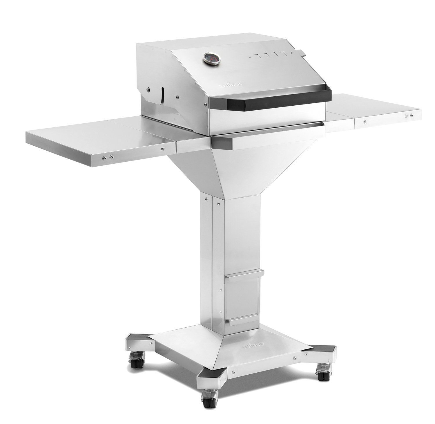 Die solide Bauweise mit robustem Standfuß und strukturierter Edelstahlkonstruktion gewährleistet Sicherheit und Benutzerfreundlichkeit. Alle Bedienelemente, inklusive Rost, Kohleschale und Zubehör, sind leicht zugänglich und intuitiv zu bedienen.